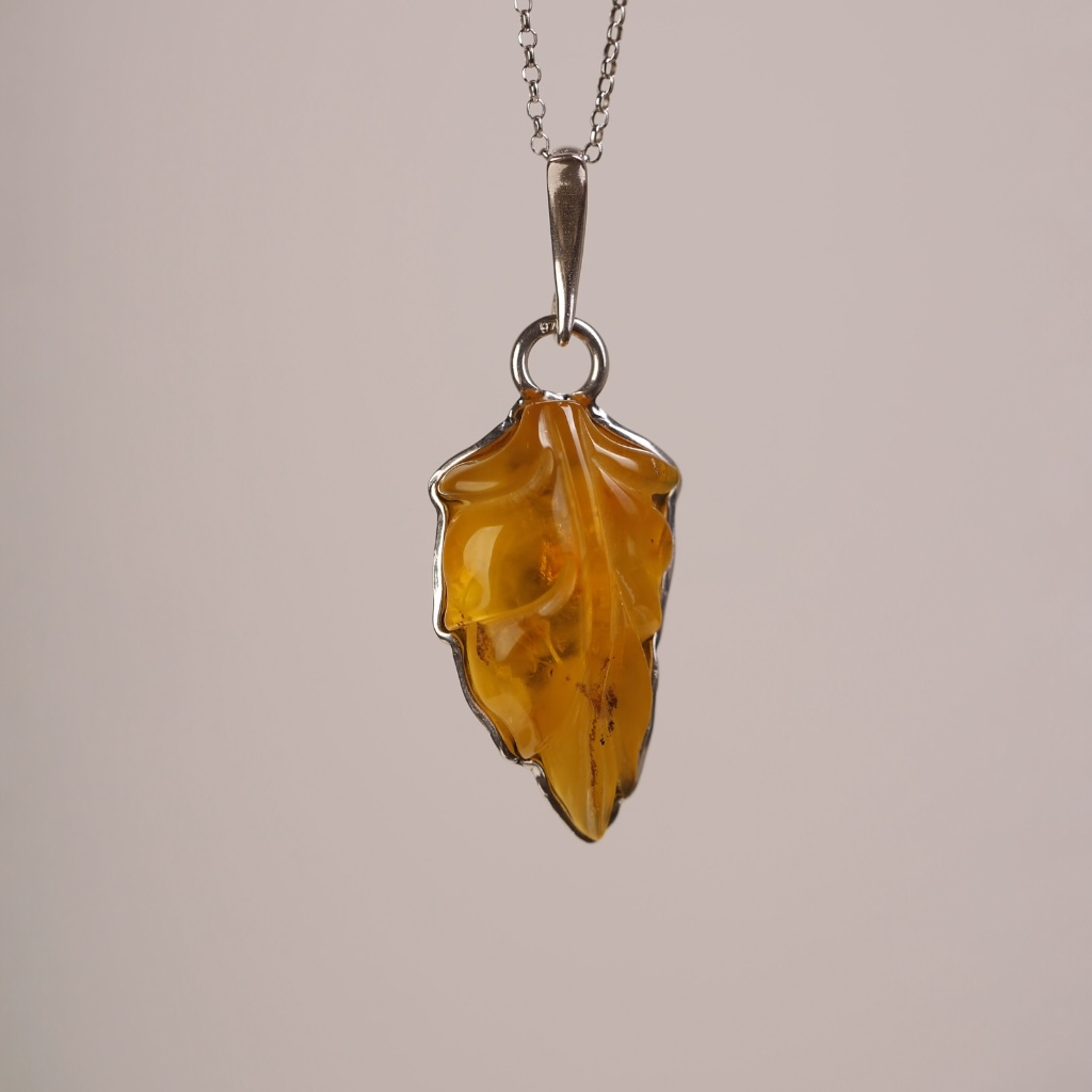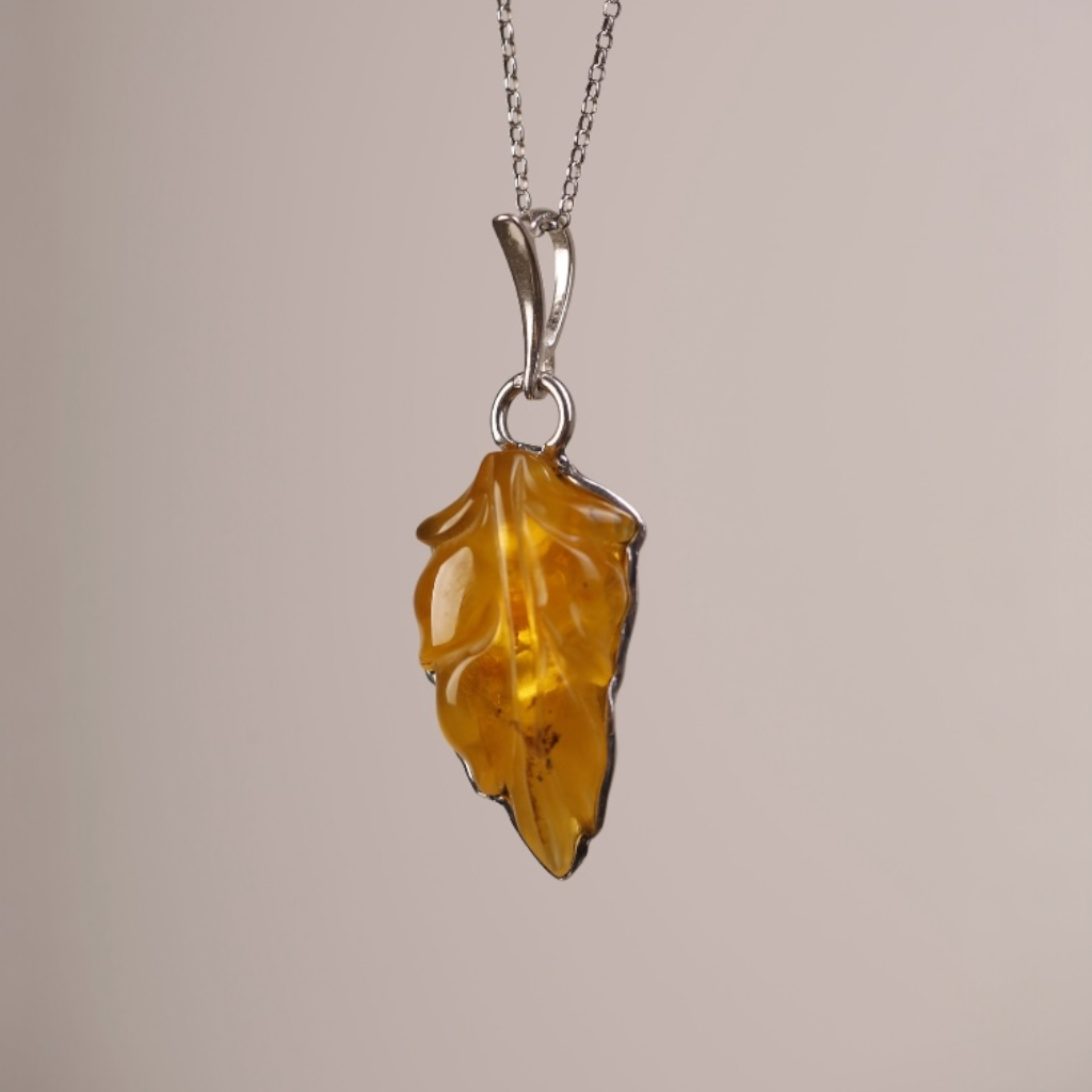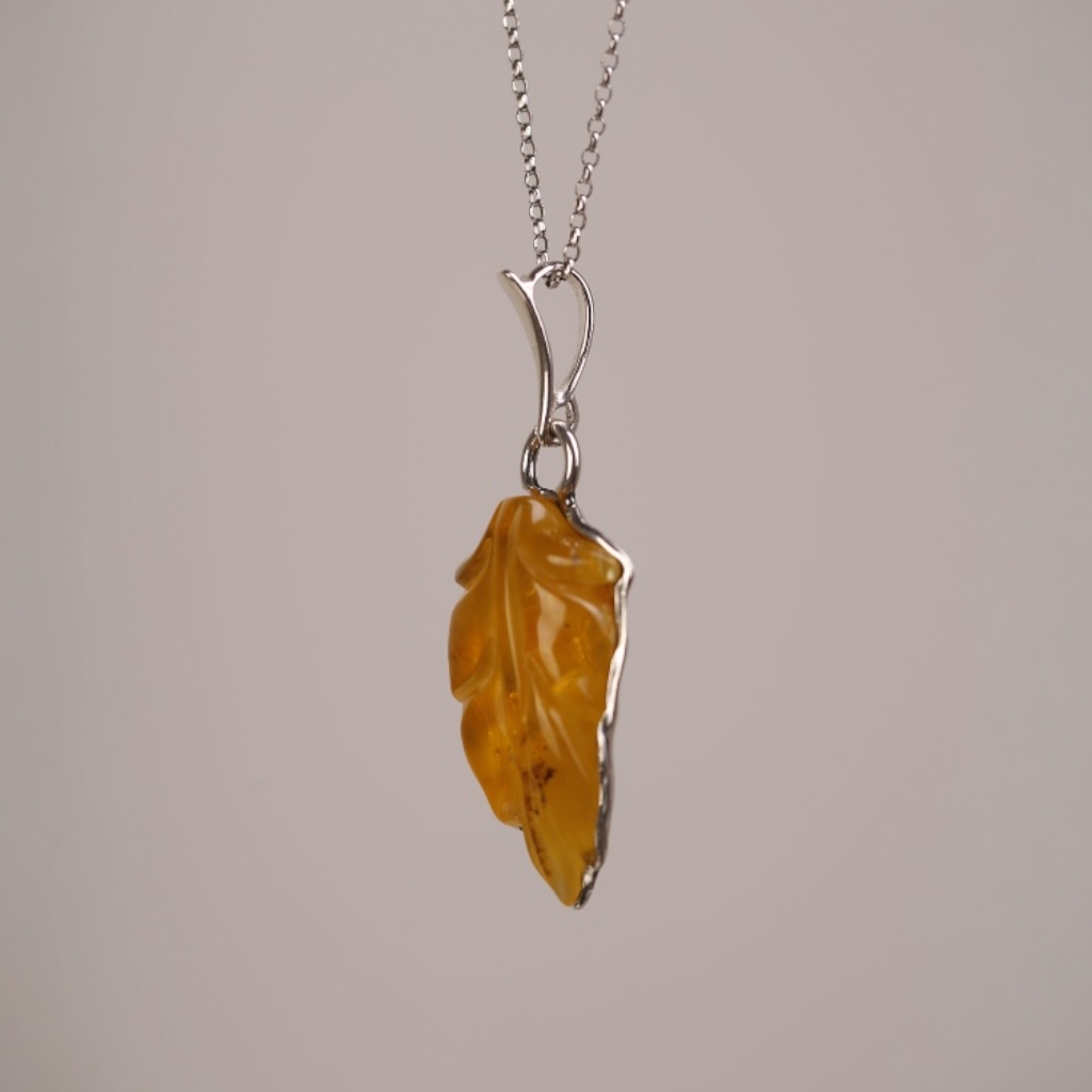 Wisiorek wykonany z naturalnego bursztynu bałtyckiego, ręcznie wyrzeźbiony w formę smukłego liścia. Delikatne żłobienia na miodowej powierzchni bursztynu podkreślają jego organiczny charakter, a minimalistyczna srebrna oprawa zapewnia całości elegancję.