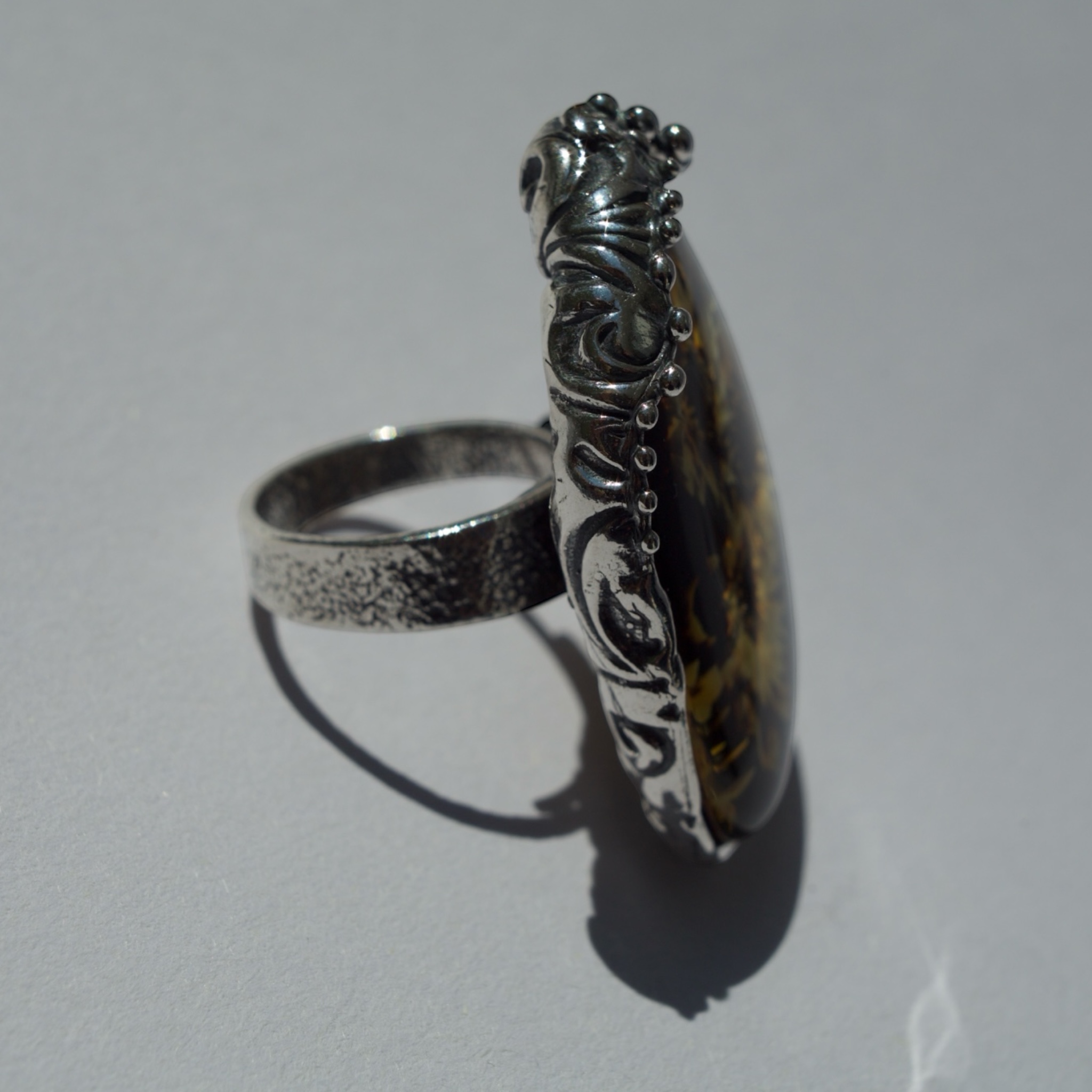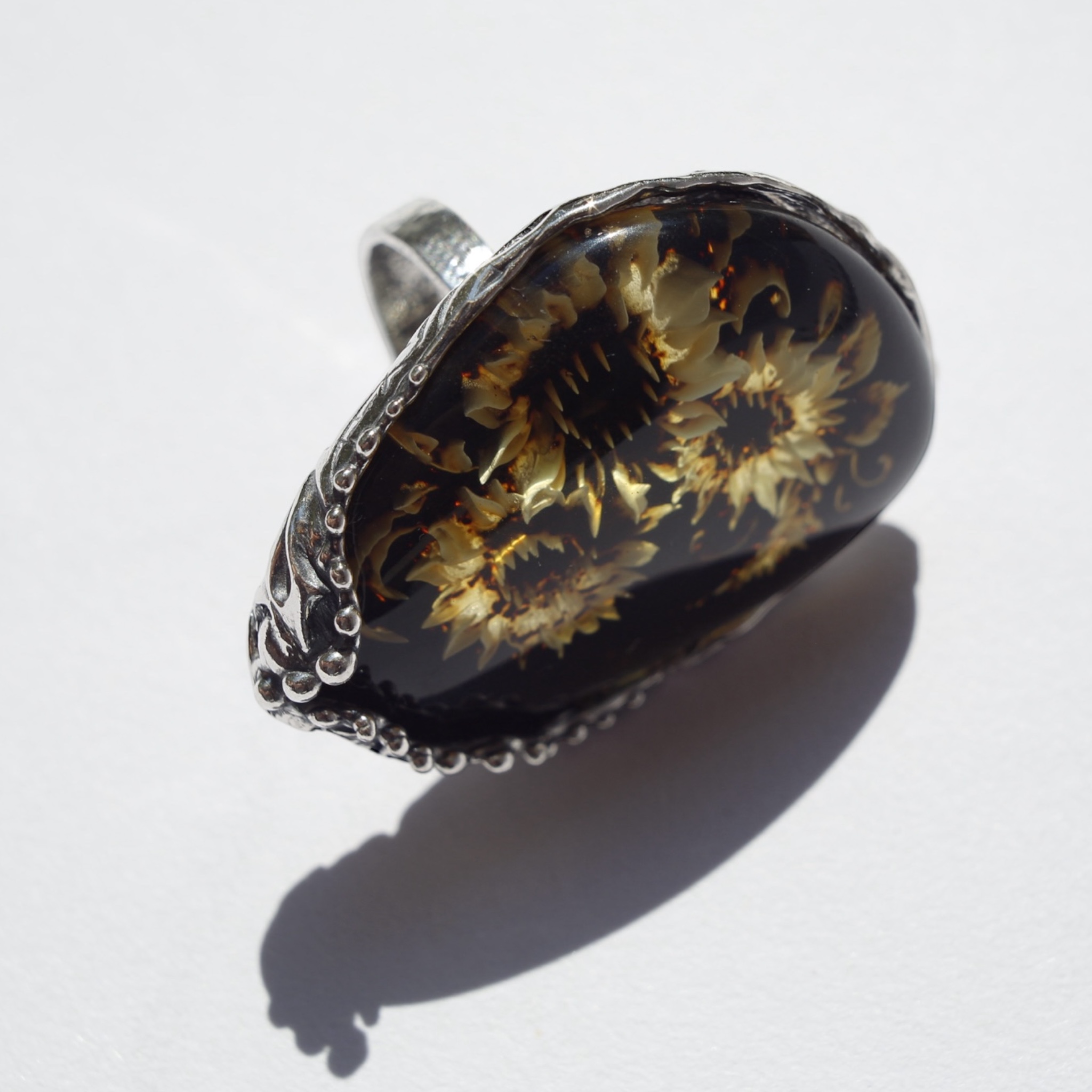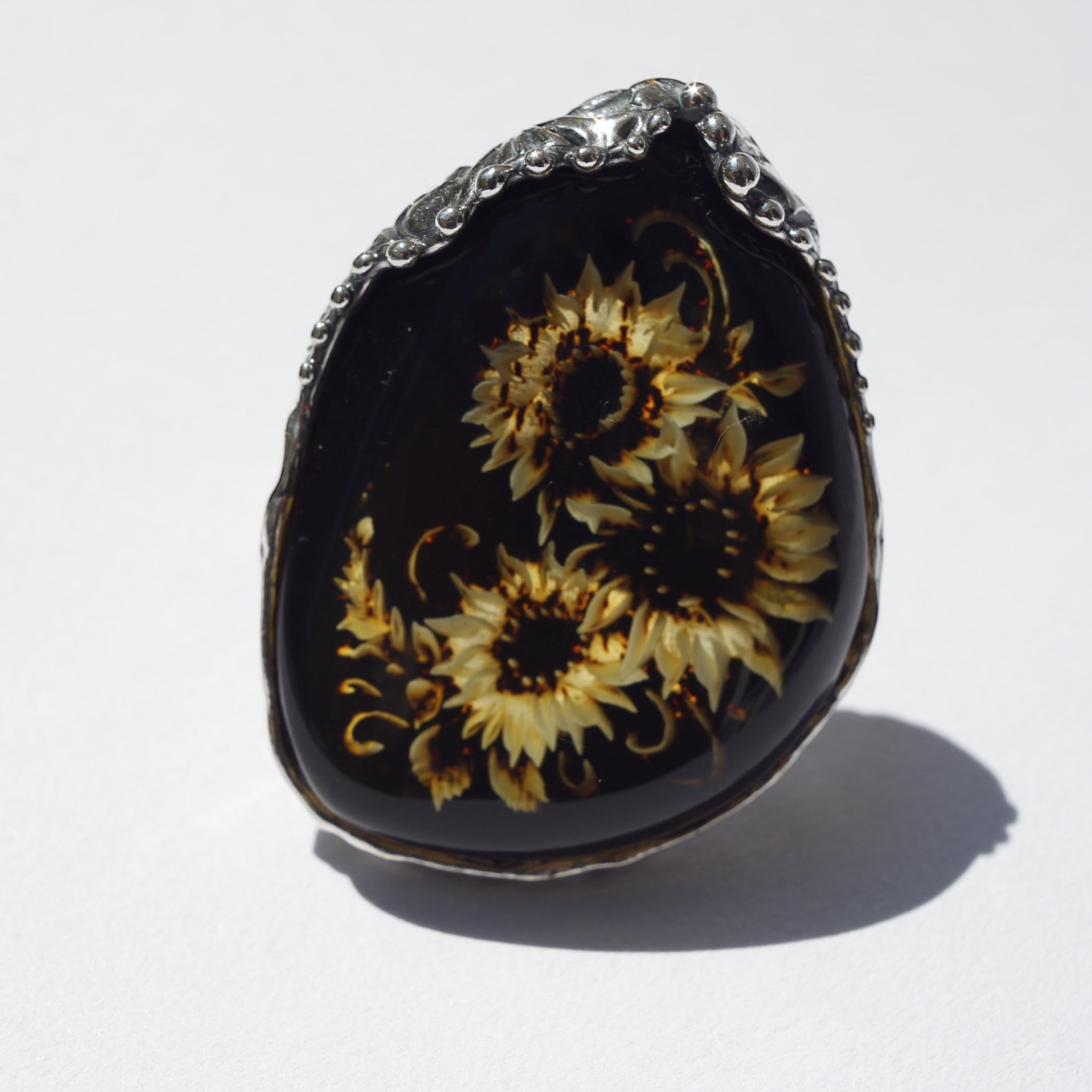 Ten pierścionek to prawdziwe małe dzieło sztuki - ręcznie wykonany ze srebra próby 925 i ozdobiony bursztynem, w którego wnętrzu wyrzeźbiono motyw słoneczników. Delikatna, misterna rzeźba zatopiona w bursztynie sprawia, że całość wygląda jak obraz. Srebrna oprawa o zdobionych krawędziach podkreśla artystyczny charakter pierścionka, a regulowana obrączka zapewnia wygodę noszenia.