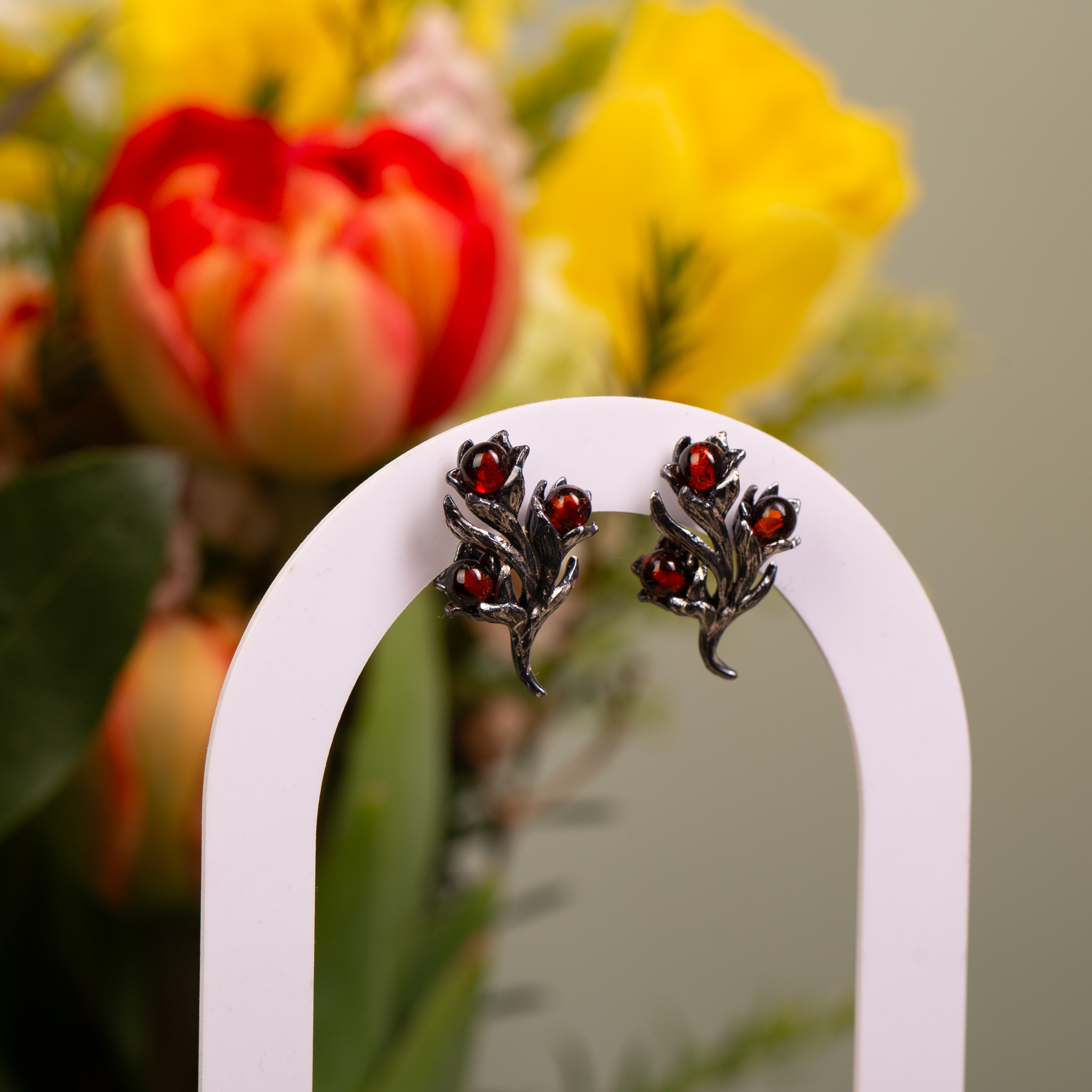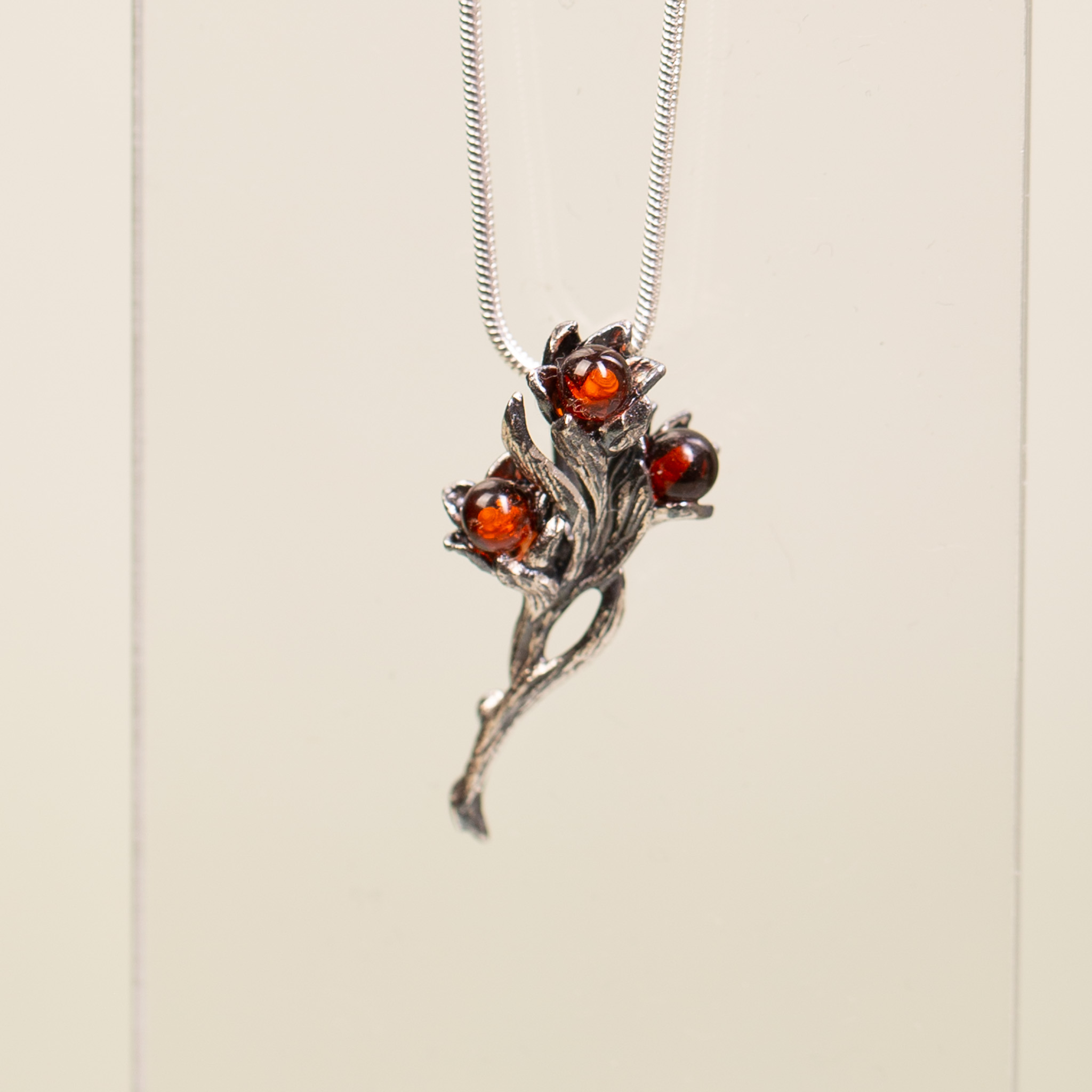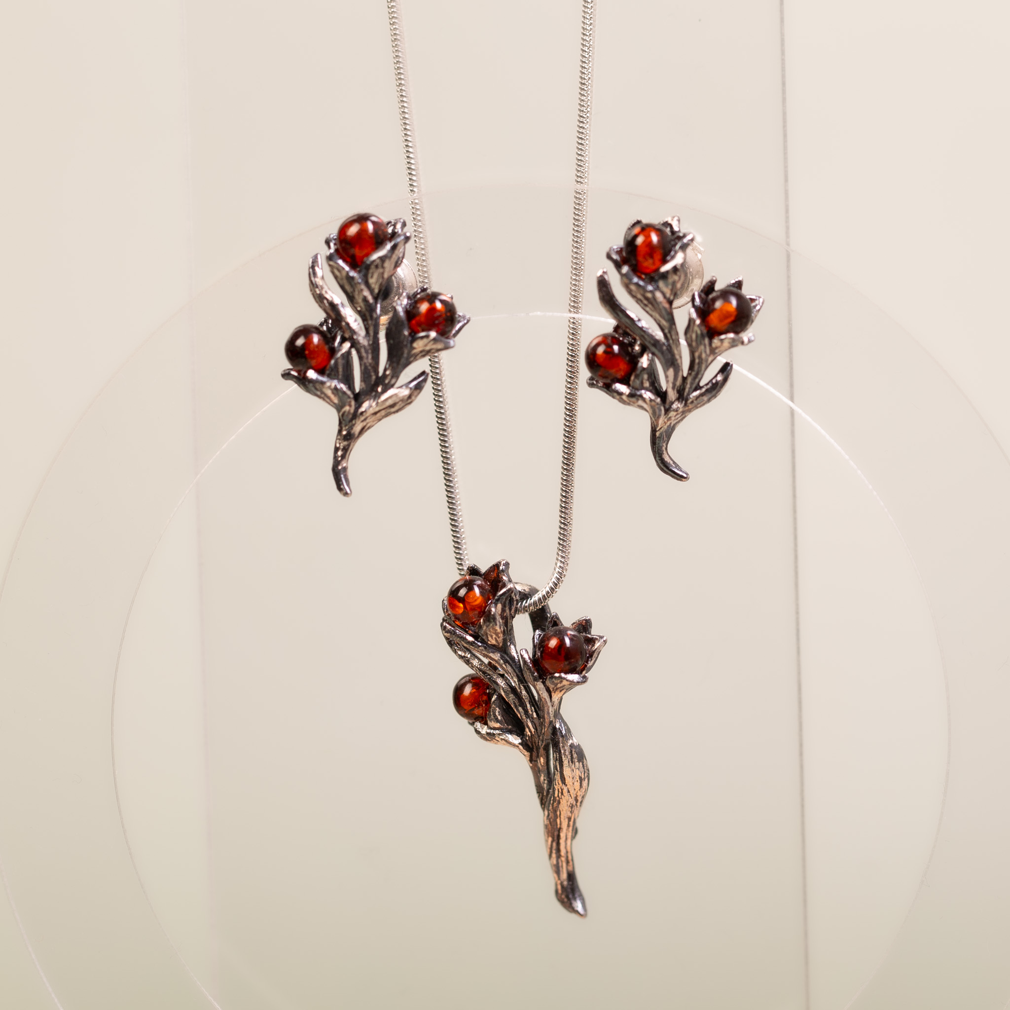 Ręcznie wykonany, niepowtarzalny zestaw biżuterii ze srebra próby 925, składający się z wisiorka oraz kolczyków na sztyfcie. Projekt inspirowany naturą przedstawia misternie rzeźbione, roślinne formy, w których osadzono drobne kulki bursztynu w głębokim, koniakowym odcieniu. Srebro zostało poddane oksydowaniu, co wydobywa detale faktury i nadaje całości szlachetny, artystyczny charakter.