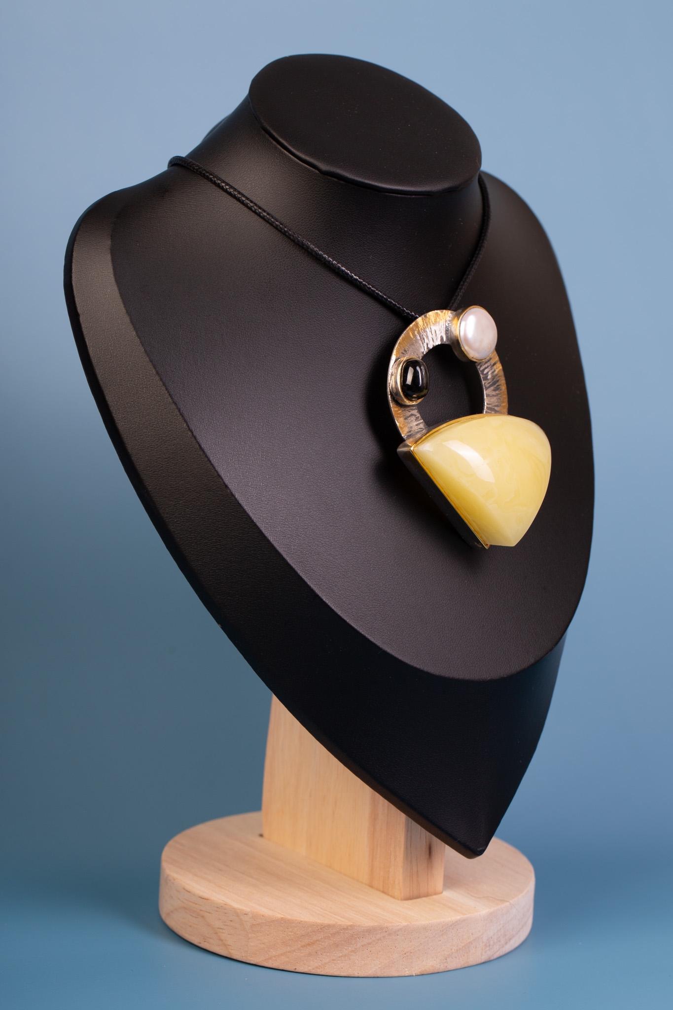 Forma i charakter: Wisior zachwyca architektoniczną, geometryczną budową. Kontrast między jasnym bursztynem, czernią onyksu i perłową poświatą tworzy elegancką i nowoczesną paletę barw. Częściowe pozłocenie srebra dodaje całości blasku i podkreśla artystyczny kunszt. Wyraźna wysokość bursztynu nadaje mu wyjątkowej objętości, sprawiając, że wisior staje się trójwymiarową rzeźbą zdobiącą dekolt.