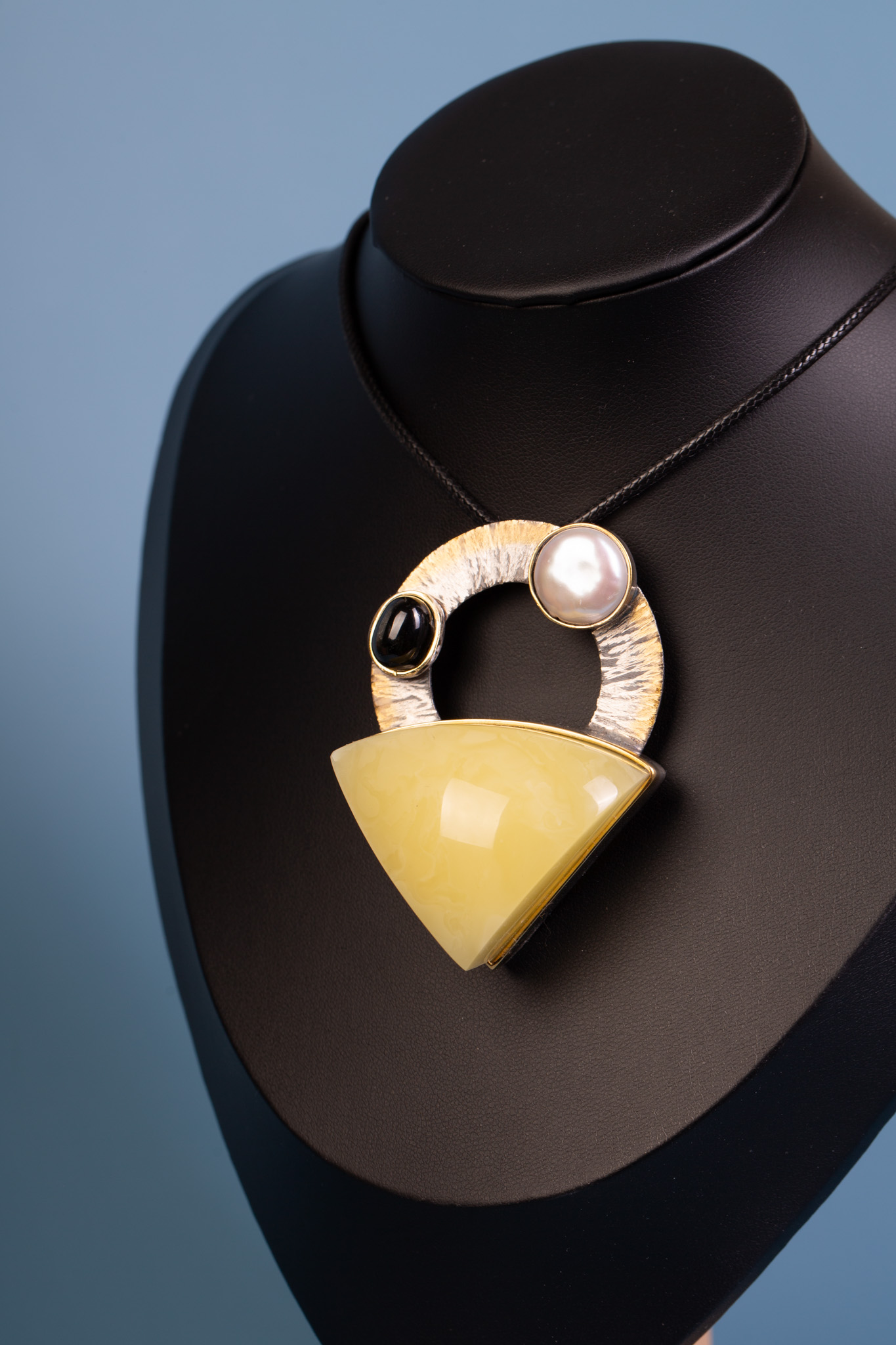 Srebro próby 925 · pozłocenie · bursztyn bałtycki · perła hodowlana · onyks · waga 40 g · wymiary 6,5 × 4,8 cm · bursztyn 4,6 × 3,5 cm · wysokość 2,3 cm · perła 1,3 cm · onyks 1 × 0,9 cm · ręczna praca autorska · bez łańcuszka