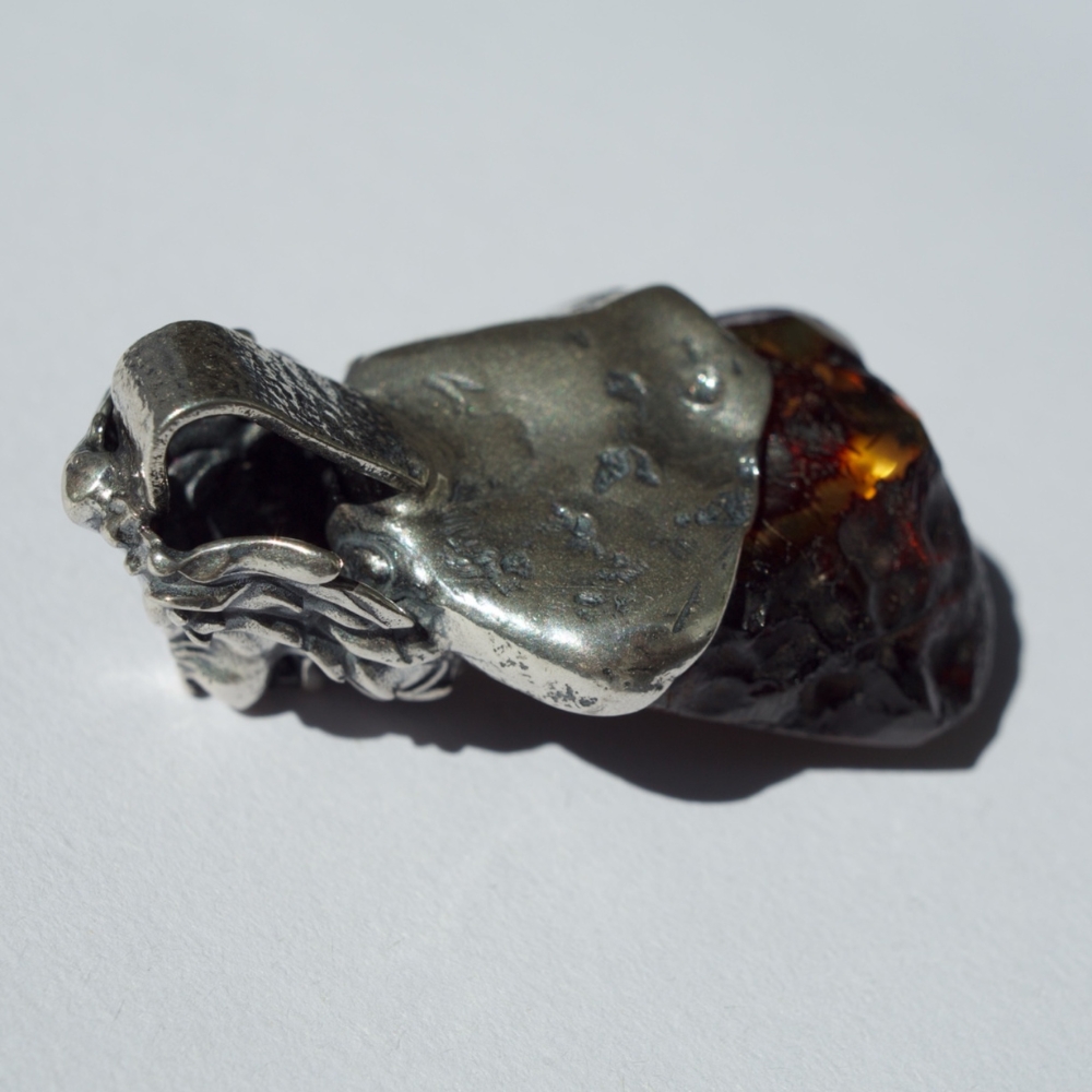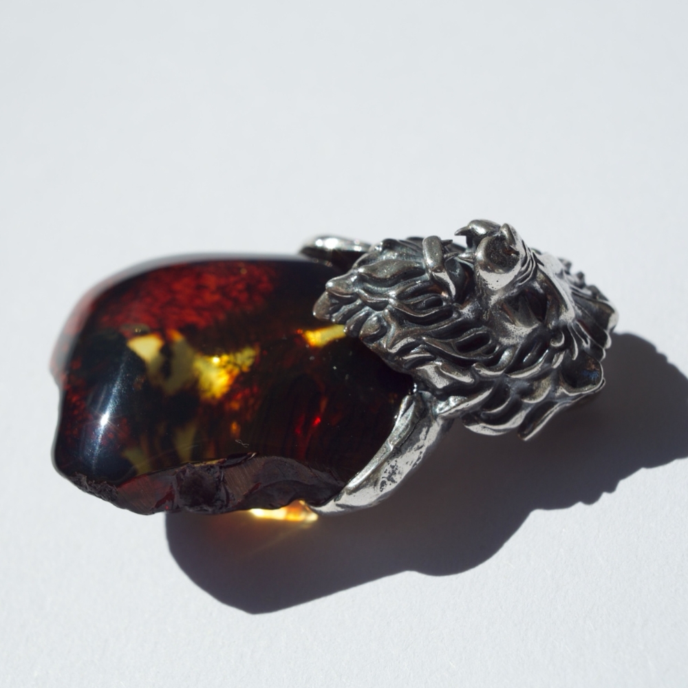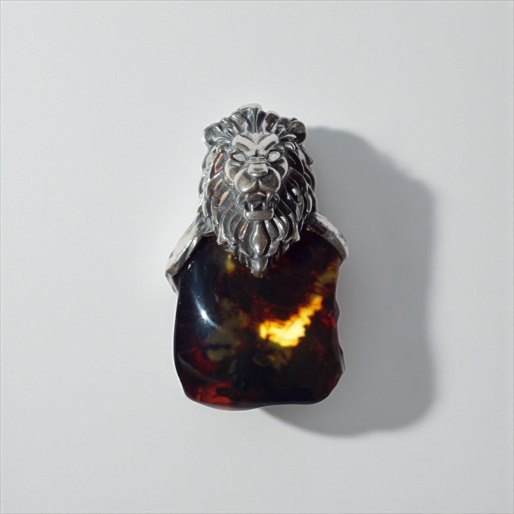 Okazały wisior o niezwykle charakterystycznym designie, w którym centralne miejsce zajmuje duży bursztyn bałtycki o głębokiej, ciemnej barwie z efektownymi refleksami światła. Nad nim znajduje się ręcznie rzeźbiona srebrna głowa lwa - symbol siły, odwagi i majestatu. To biżuteria, która przyciąga uwagę i stanowi wyjątkowy, artystyczny akcent.