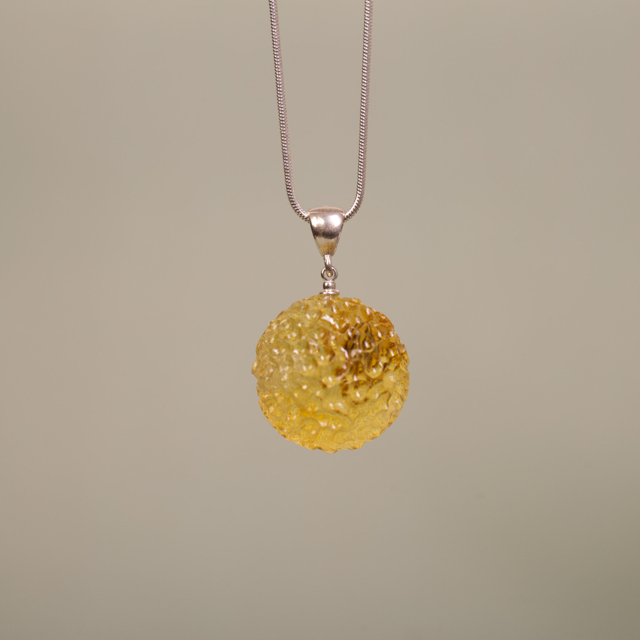Artystyczny wisiorek wykonany z bursztynu bałtyckiego w rzadkim, jasnym kolorze cytrynowym. Bursztyn otrzymał unikatową, ręcznie rzeźbioną formę kuli o fakturowanej powierzchni, która efektownie rozprasza światło. To nowoczesny i oryginalny dodatek, który łączy minimalistyczną formę z bogatą, naturalną strukturą.