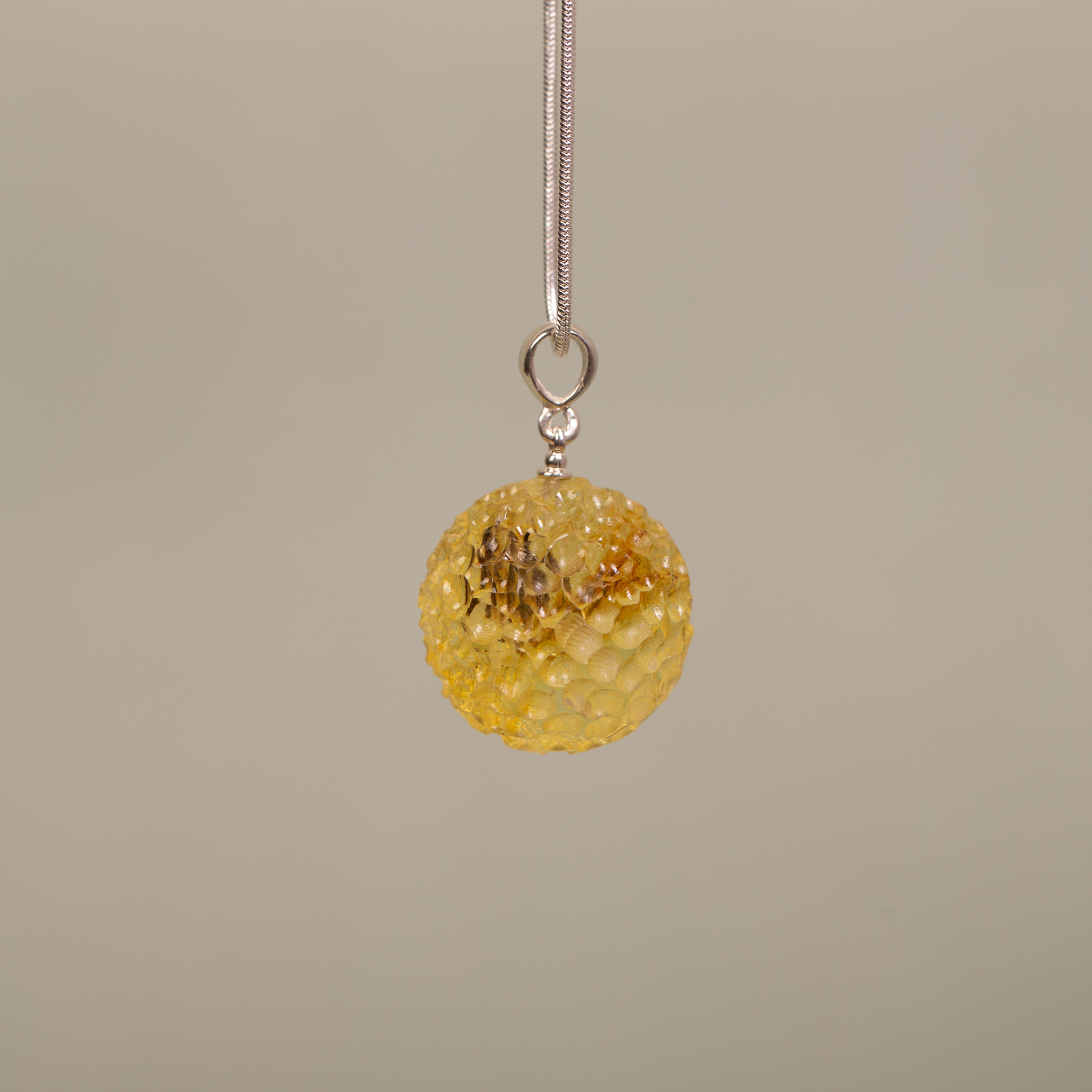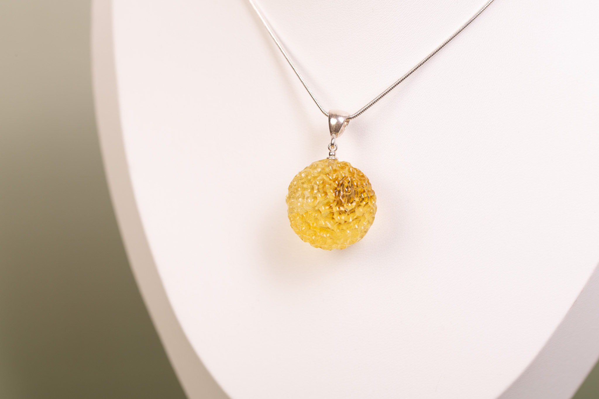 Srebro próby 925 · bursztyn bałtycki cytrynowy (rzeźbiony) · waga: 5,6 g · średnica kulki: ok. 2,2 cm · bez łańcuszka · ręczna praca autorska