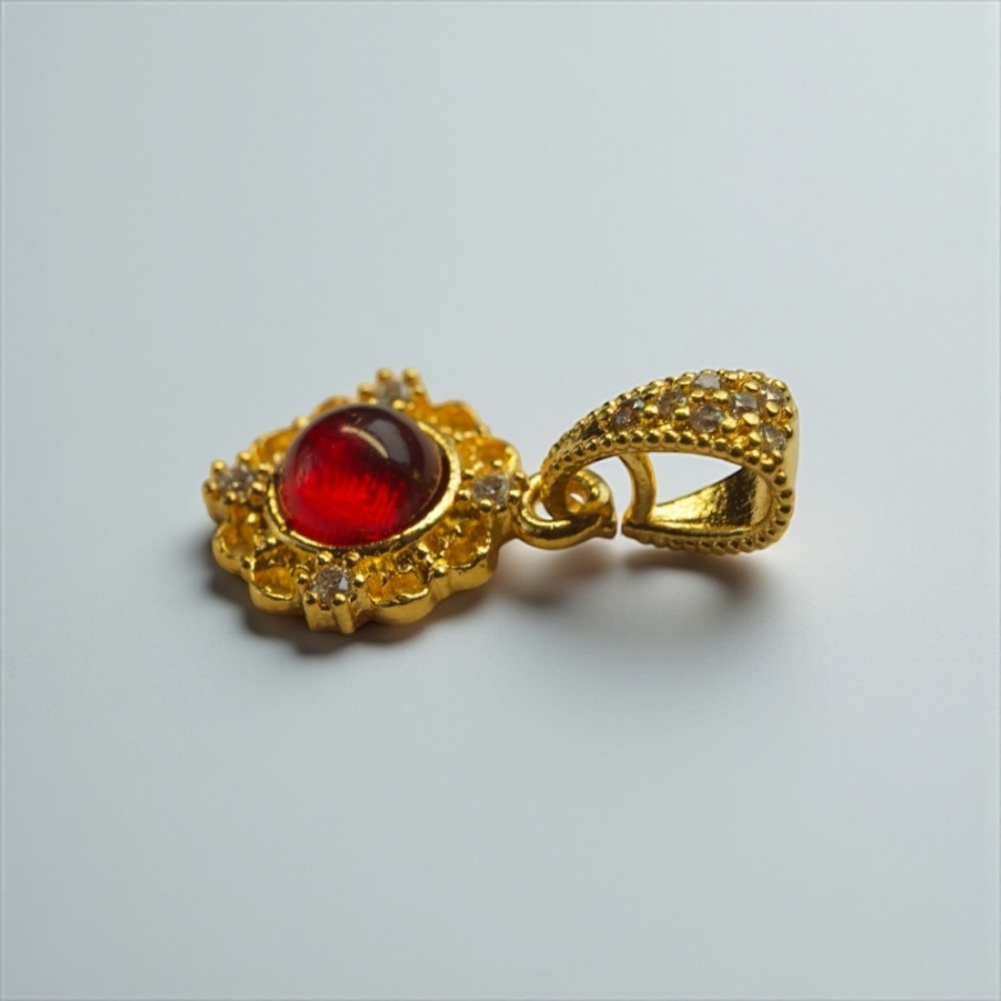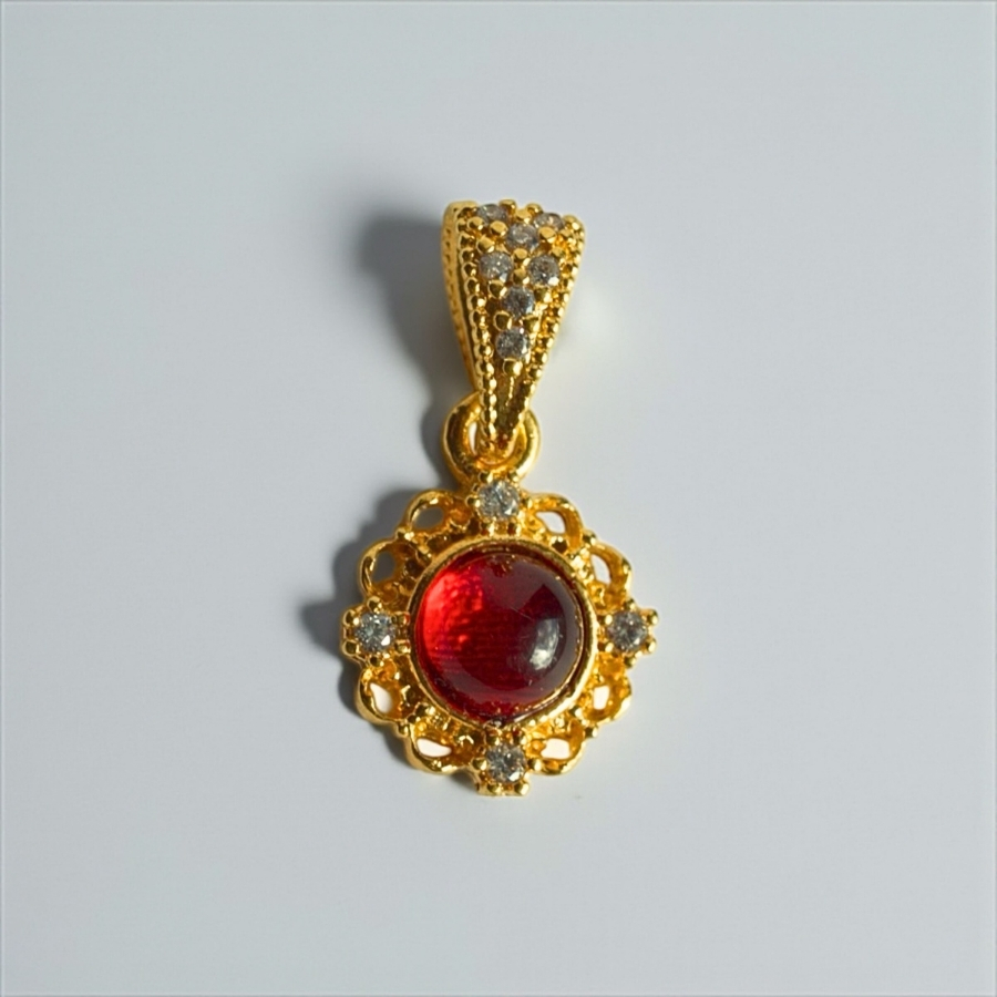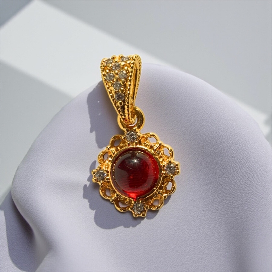 Delikatny wisiorek o ponadczasowym uroku – wiśniowy bursztyn w złoconej oprawie subtelnie ozdobionej cyrkoniami. Lekki i elegancki, pięknie rozświetli dekolt i doda blasku każdej stylizacji.