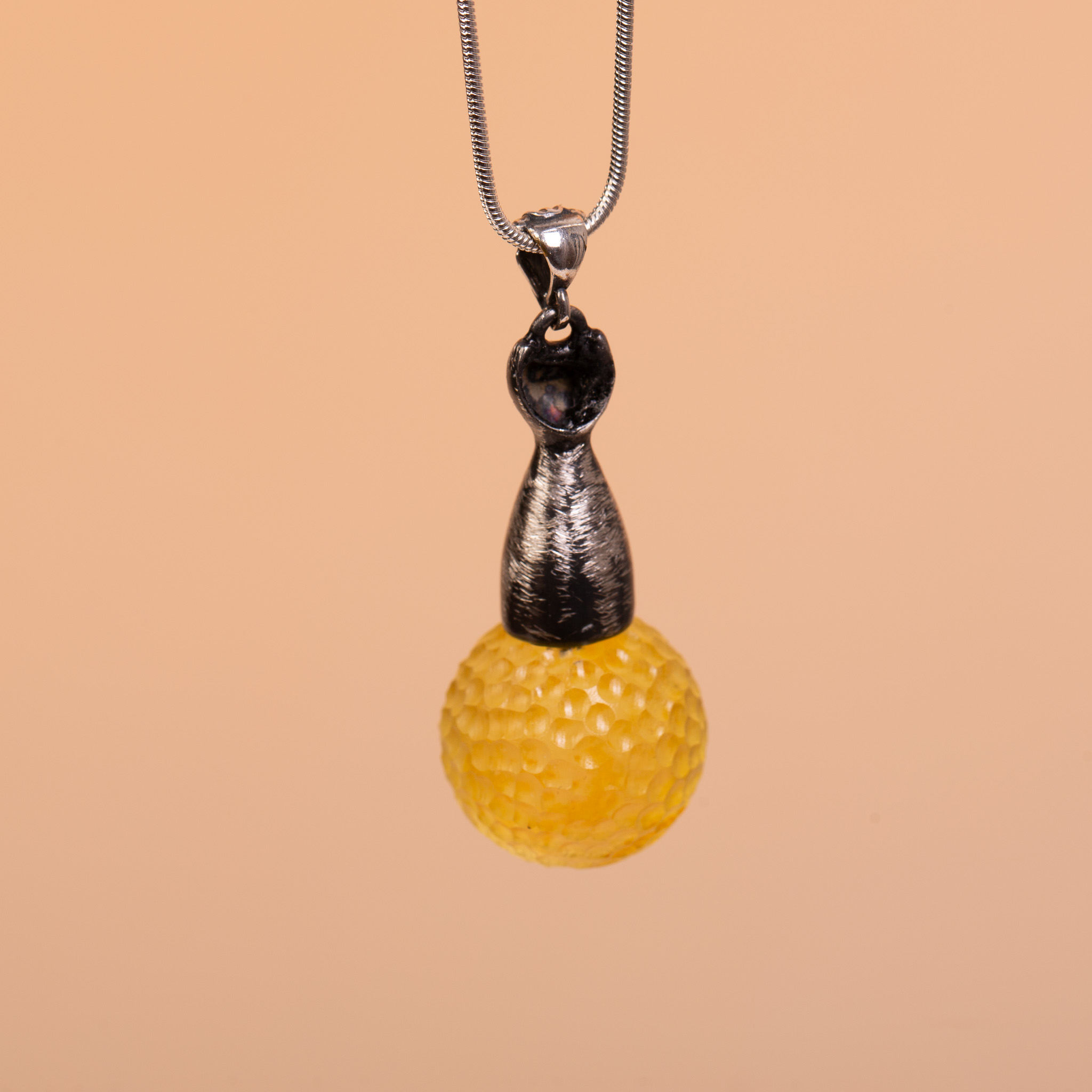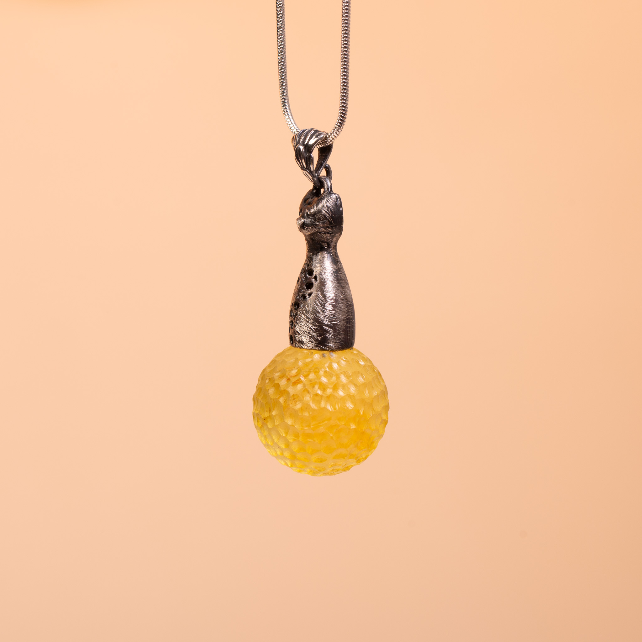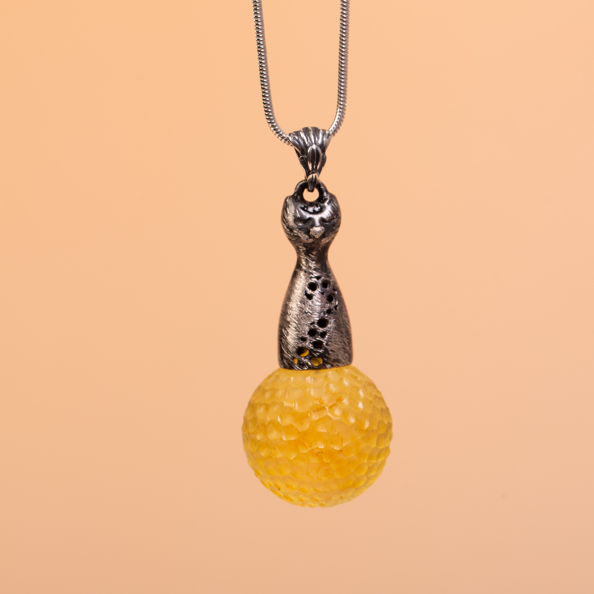 Oryginalny, ręcznie wykończony wisiorek wykonany ze srebra próby 925. Projekt przedstawia rzeźbiarską figurkę kota, która stabilnie spoczywa na kulce cytrynowego bursztynu. Bursztyn posiada unikatową, fakturowaną powierzchnię, która pięknie „łapie” światło, a oksydowane srebro dodaje całości szlachetnego, nieco surowego charakteru.