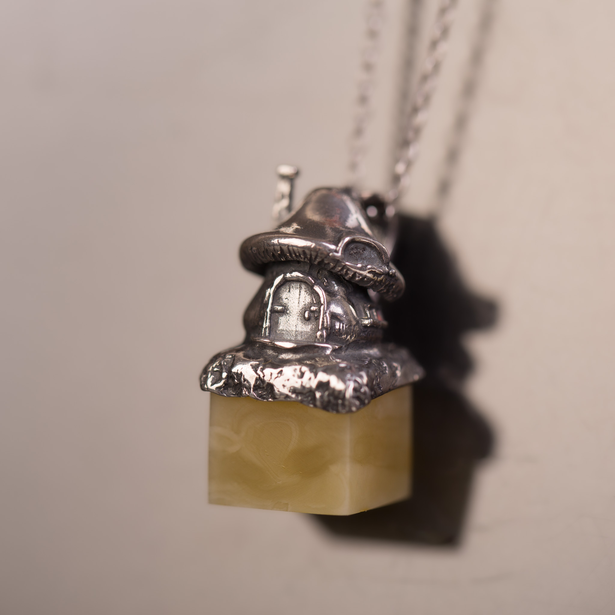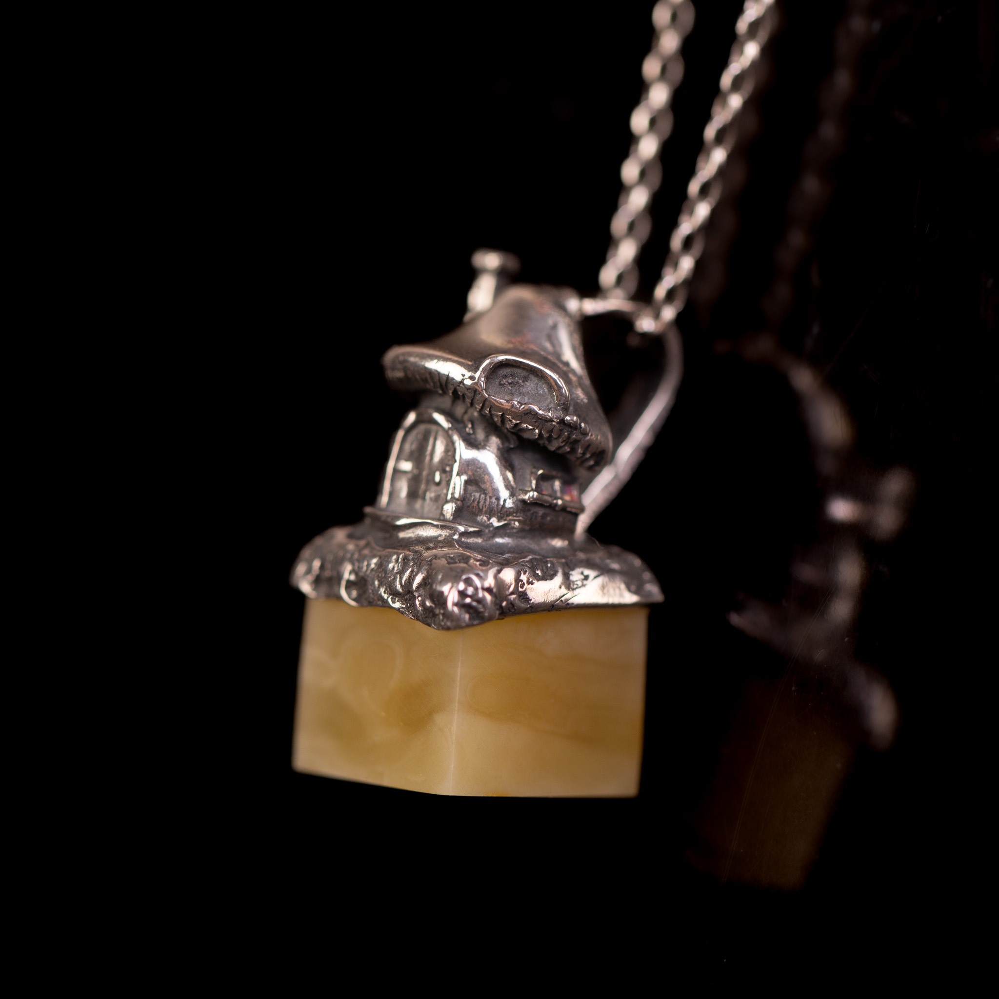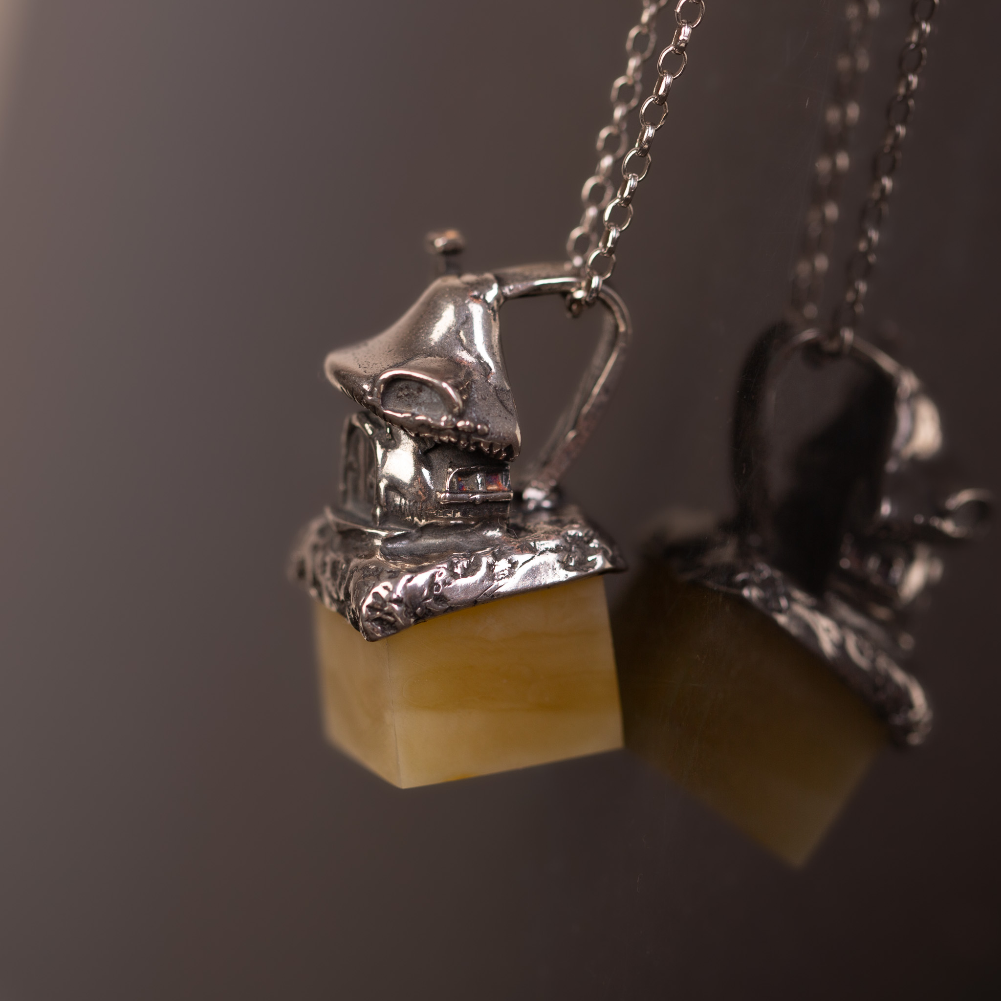 Forma i charakter: Przestrzenna, „scenkowa" kompozycja domku i bursztynu tworzy miniaturowy obiekt artystyczny. Wisiorek świetnie wygląda zarówno sam, jak i w parze z pierścionkiem z tej samej linii — tworząc spójny, osobisty zestaw.