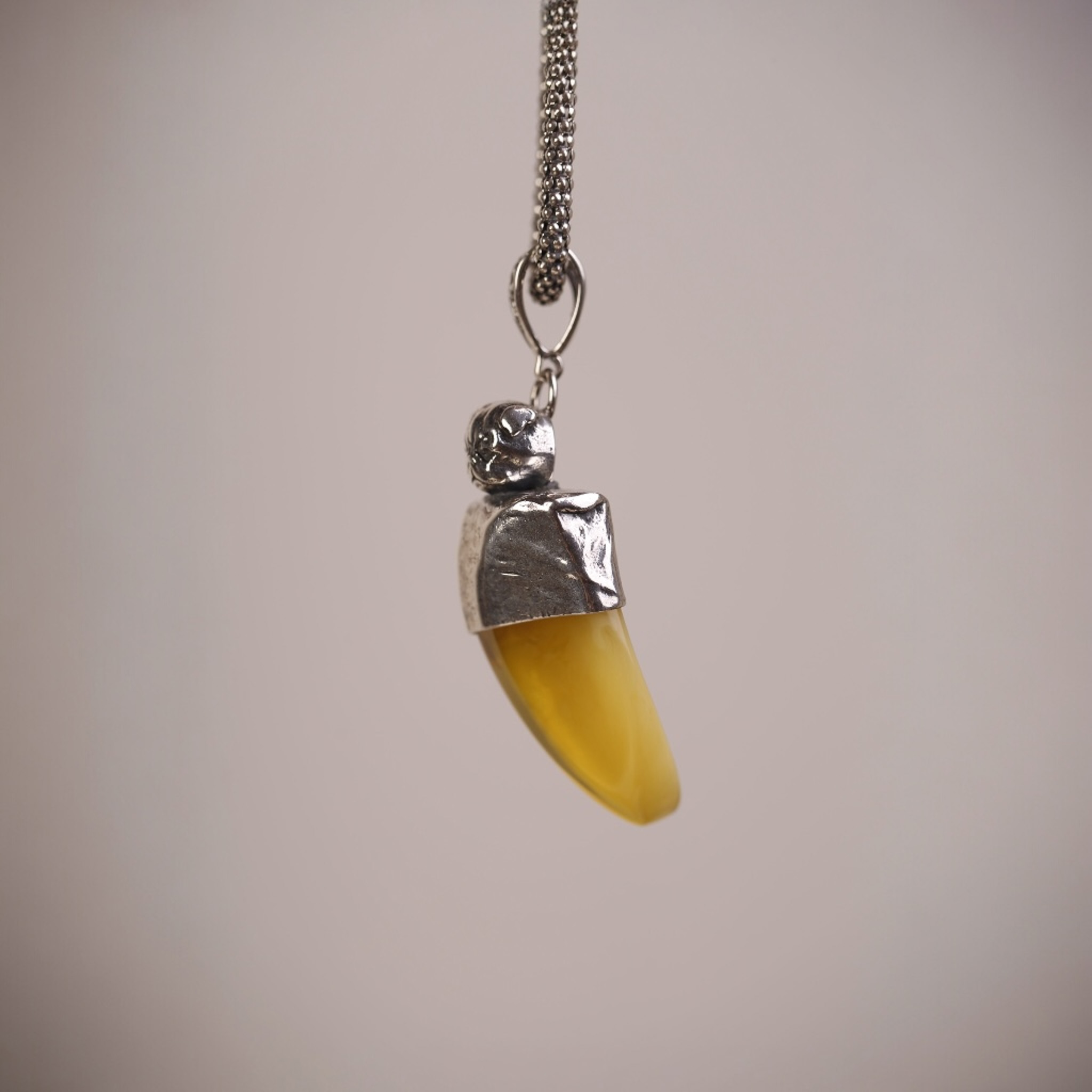 Srebro próby 925 · naturalny bursztyn bałtycki (mleczny) · waga 25,7 g · wymiary 7,6 × 2,6 cm · wykonanie ręczne · bez łańcuszka