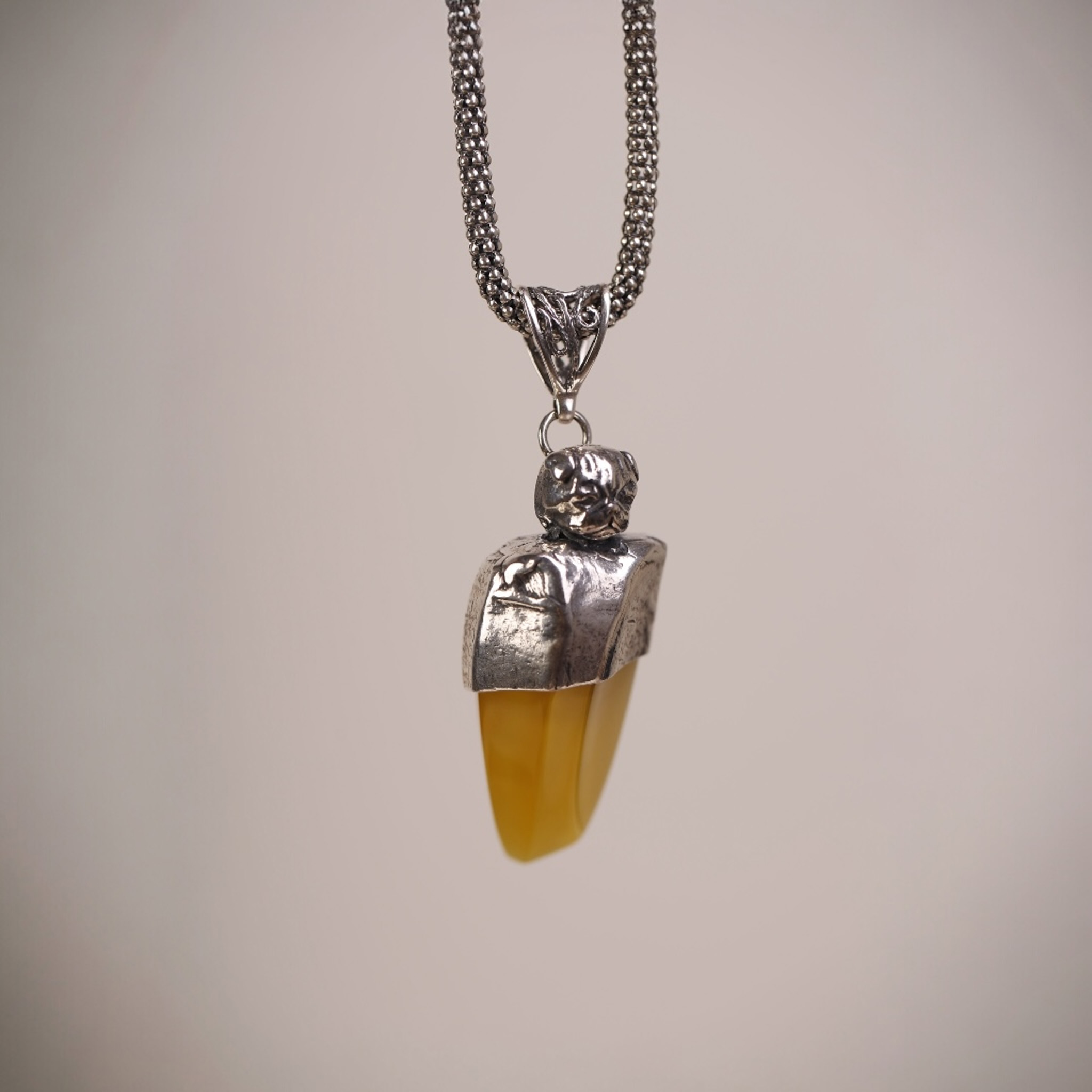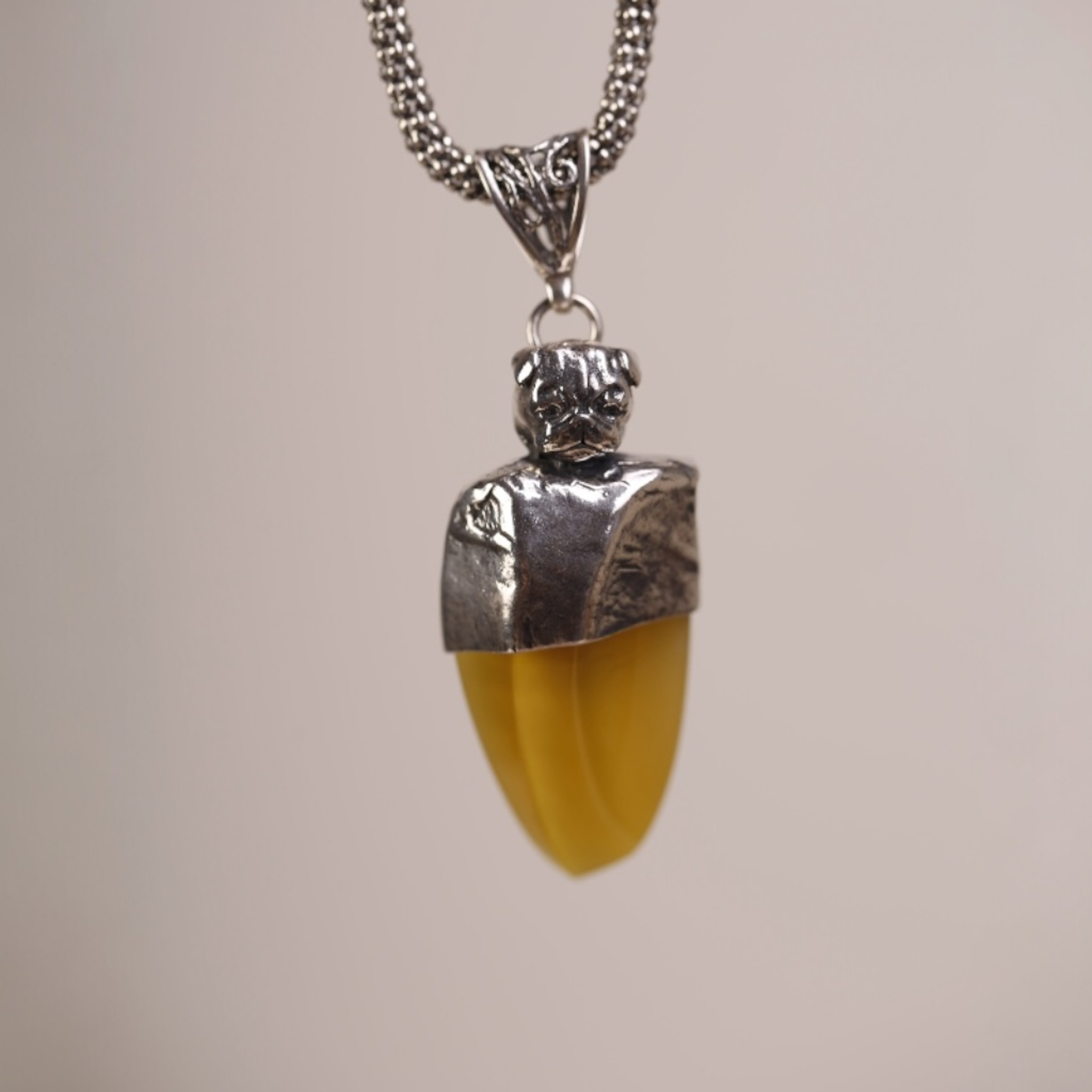 Ręcznie wykonany wisiorek ze srebra próby 925 z naturalnym bursztynem bałtyckim w ciepłym, mlecznym odcieniu. Centralnym elementem kompozycji jest dopracowana, trójwymiarowa rzeźba mopsa – wyrazista, pełna charakteru i wyraźnie modelowana. Gładka powierzchnia bursztynu kontrastuje z masywną, rzeźbiarską formą srebra, tworząc autorską biżuterię o silnej osobowości.