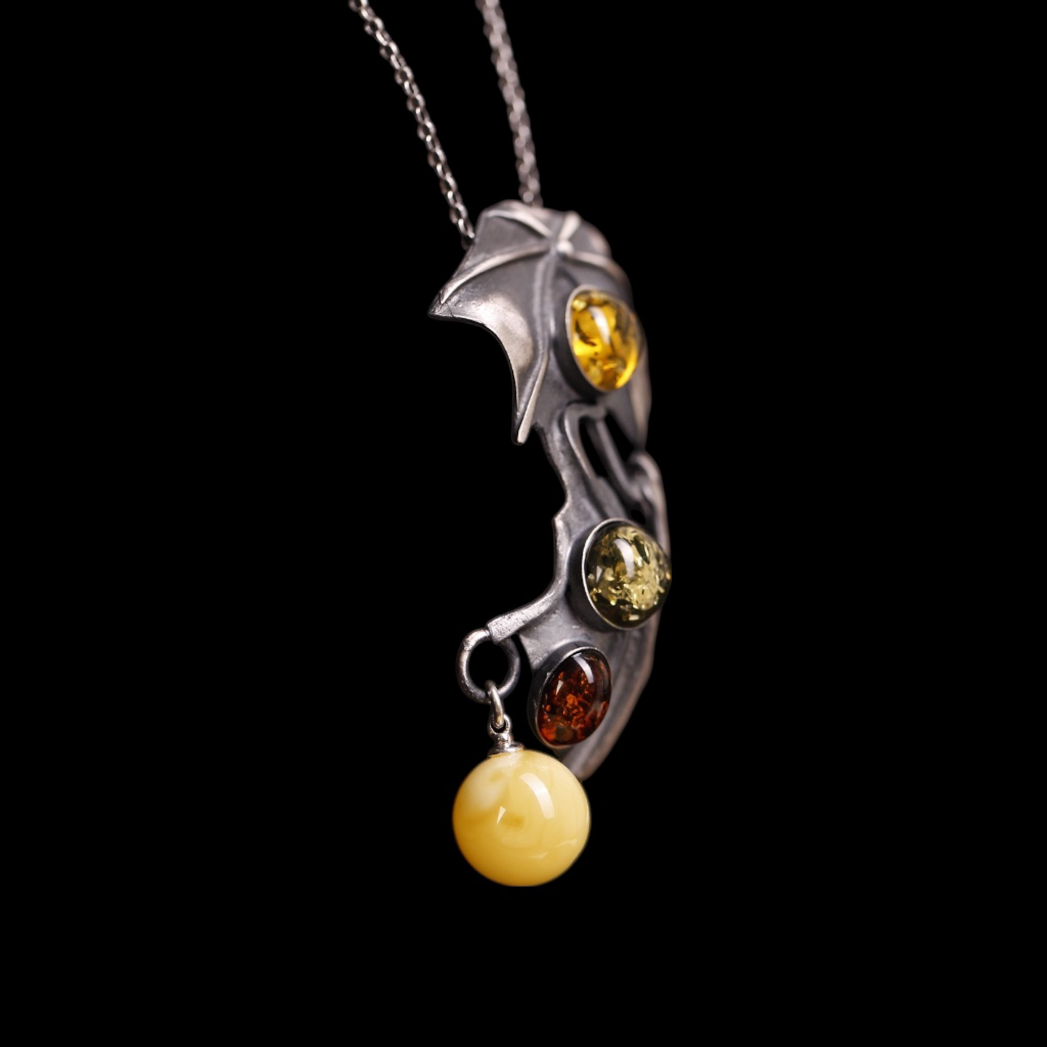 Forma: Ilustracyjna, lekka kompozycja o wyraźnym rysunku. Różne kształty bursztynów nadają pracy ruch i narracyjny charakter, podkreślony oksydowanym srebrem.