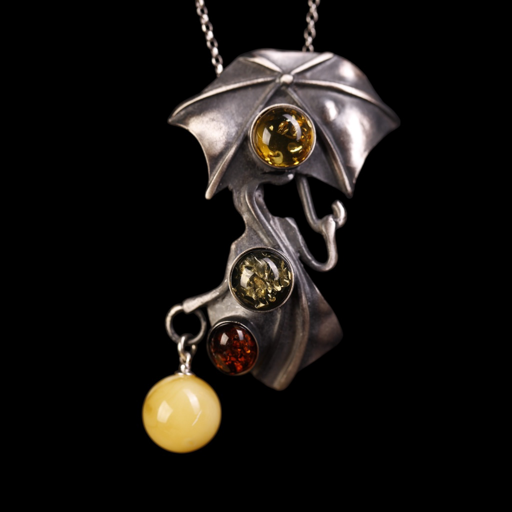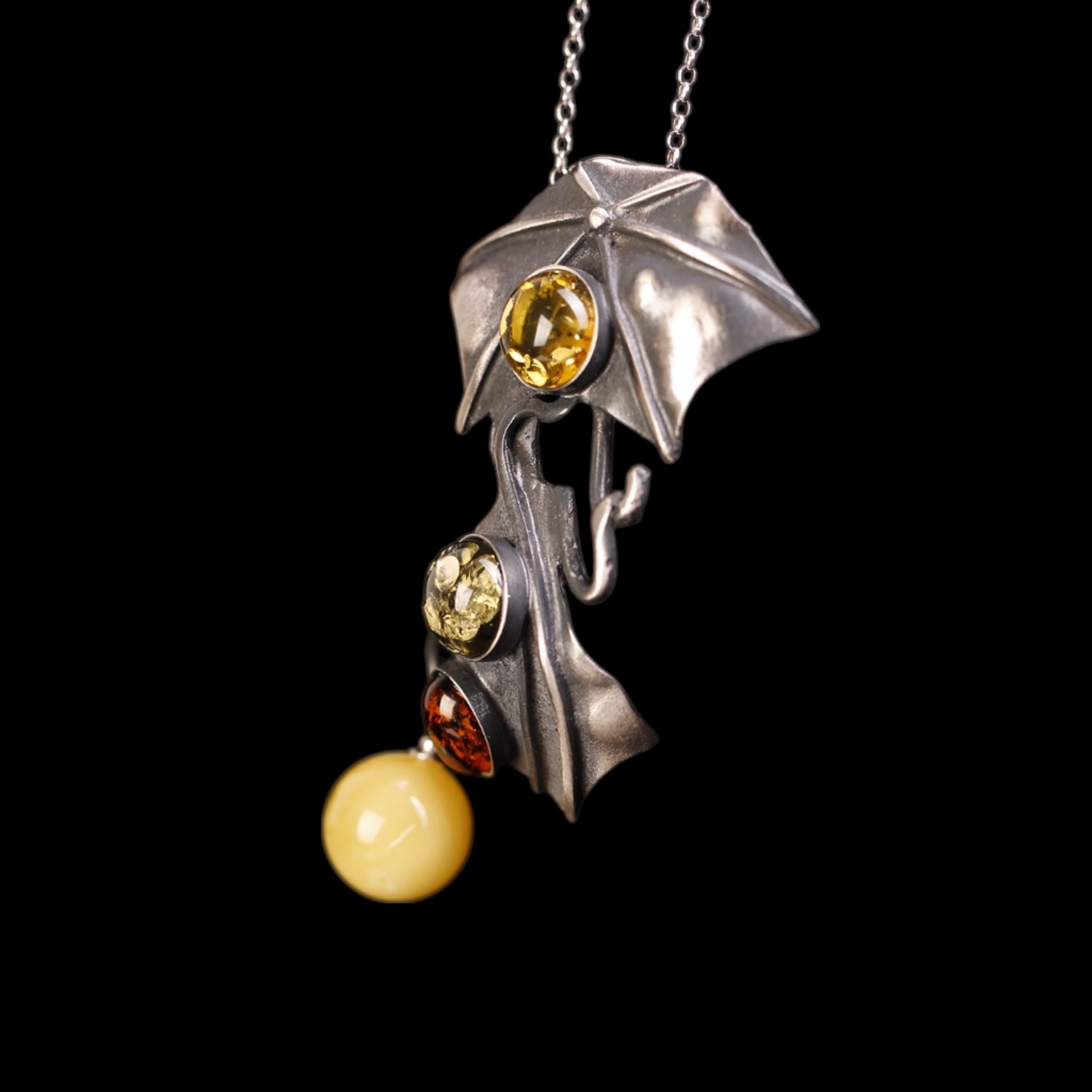 Wisiorek ze srebra oksydowanego, przypominający kadr z poetyckiej historii. Subtelna postać z parasolką niesie cztery bursztyny jak kolorowe krople deszczu. Mleczna kulka miękko porusza się przy każdym ruchu, cytrynowy bursztyn rozświetla całość, zielony dodaje świeżości, a koniakowy wprowadza ciepło i głębię.