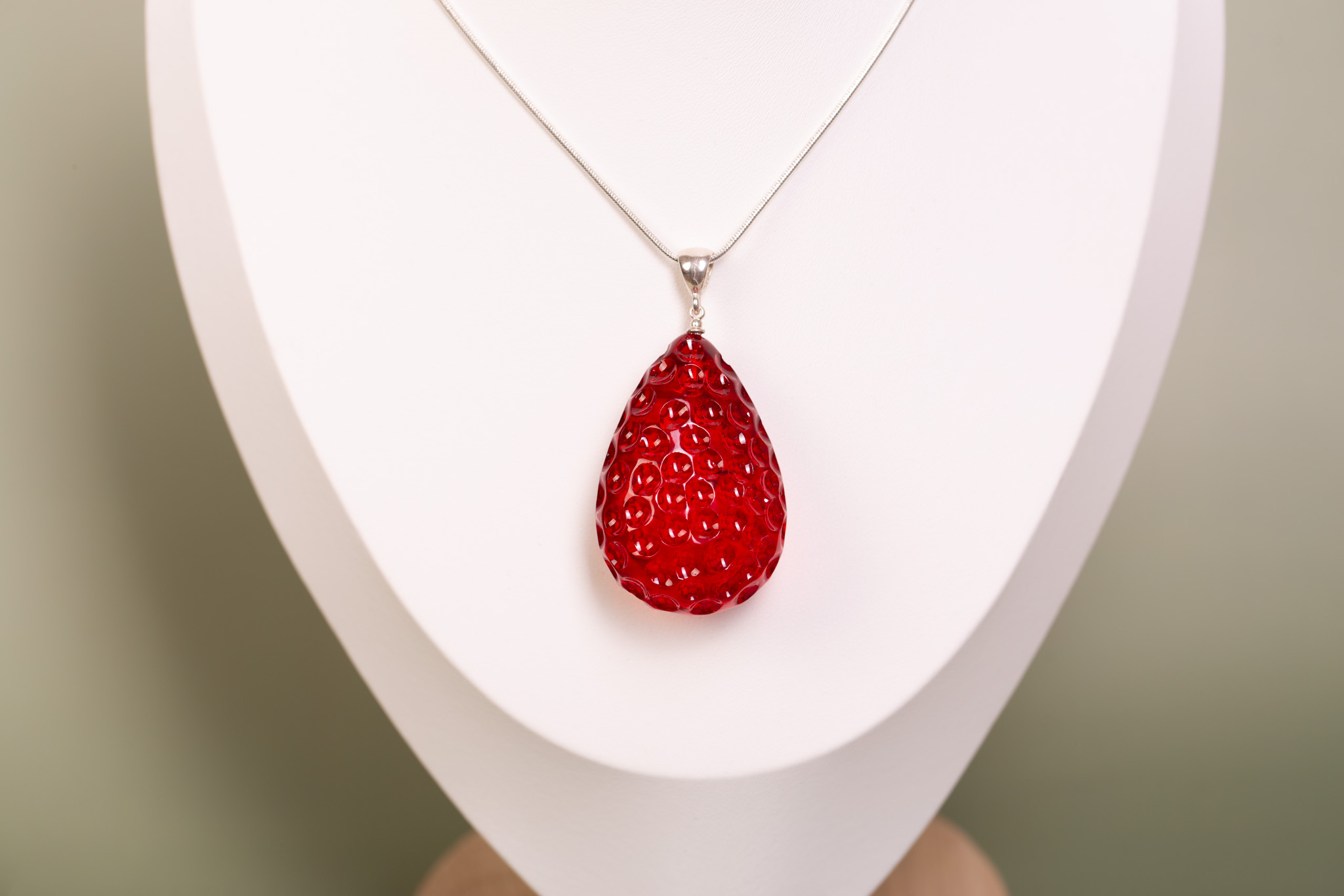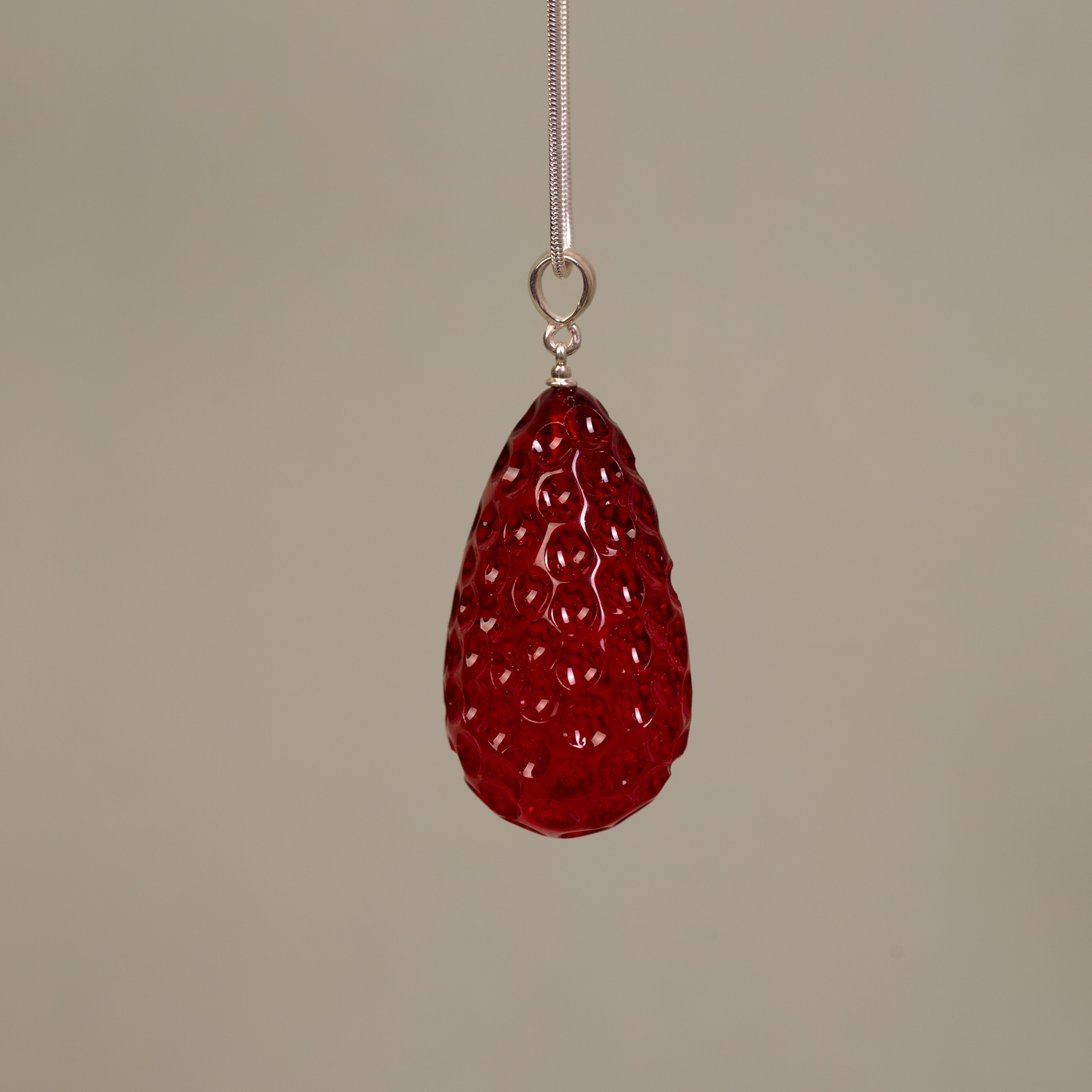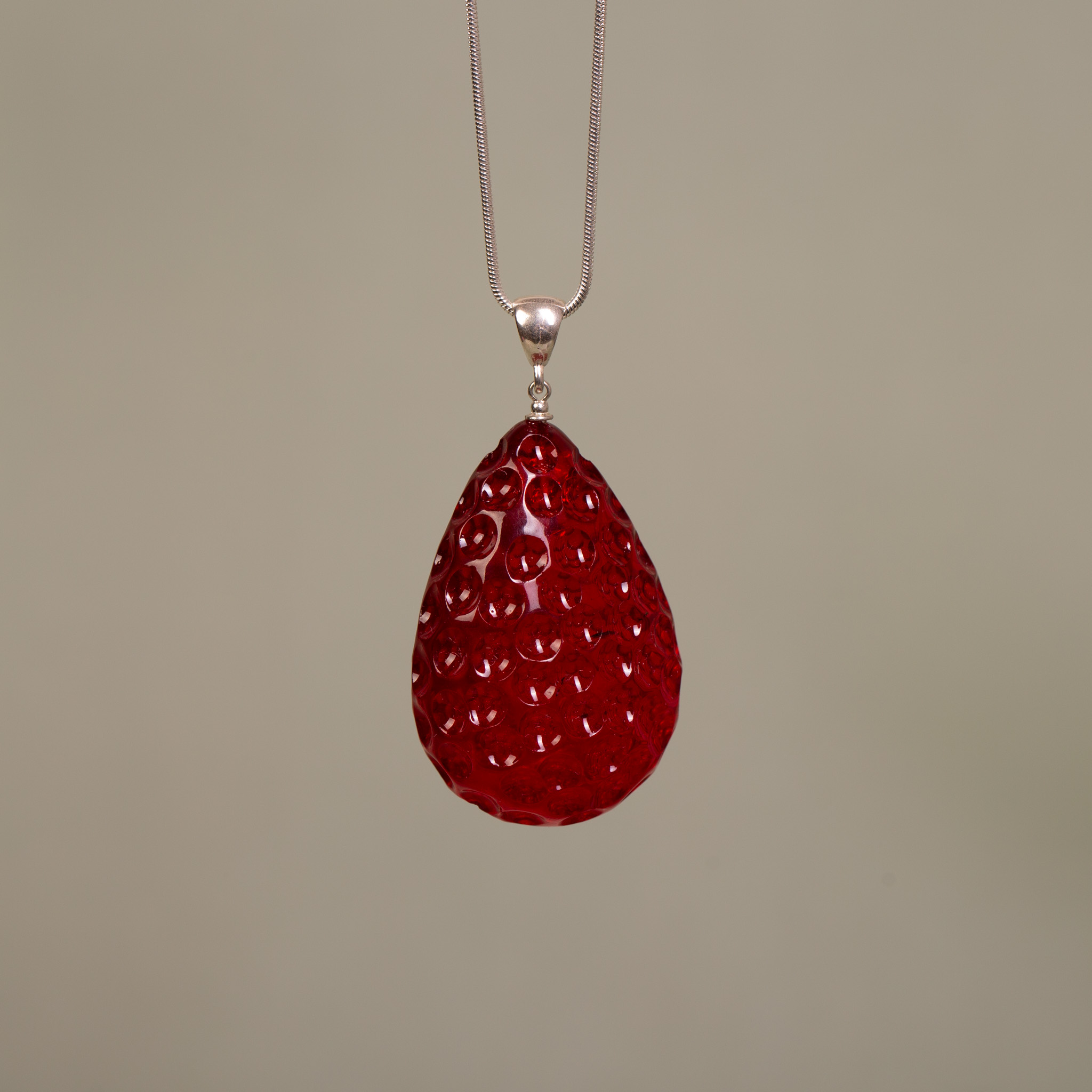 Artystyczny wisiorek wykonany z bursztynu bałtyckiego, który został poddany procesowi barwienia na intensywny, soczysty czerwony kolor. Bursztyn otrzymał unikatową, rzeźbioną formę, która swoją fakturą i kształtem do złudzenia przypomina dojrzałą truskawkę. To biżuteria o niezwykle wyrazistym charakterze, łącząca naturalny surowiec z nowoczesną, owocową stylistyką.