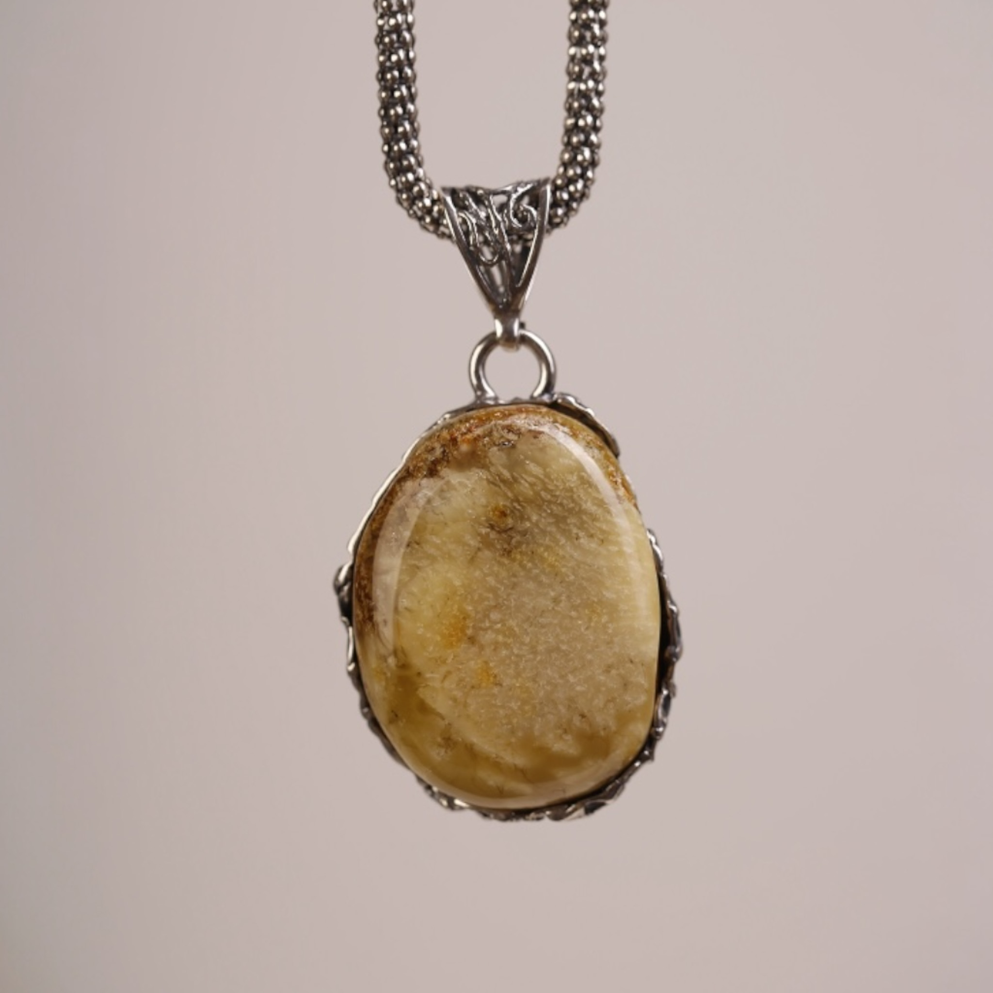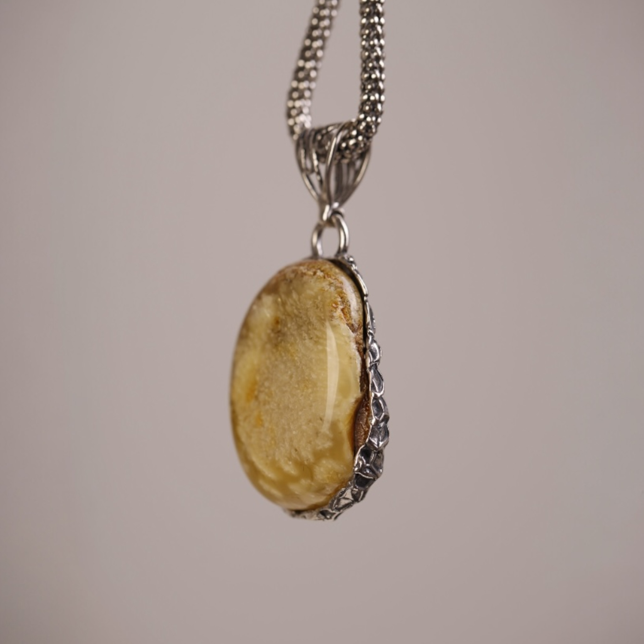 Wyrazisty wisiorek wykonany ręcznie ze srebra próby 925 oraz naturalnego bursztynu bałtyckiego o ciepłym, kremowo‑miodowym odcieniu. Srebrna oprawa o unikatowej strukturze plastra miodu tworzy trójwymiarową ramę dla gładkiej tafli bursztynu.