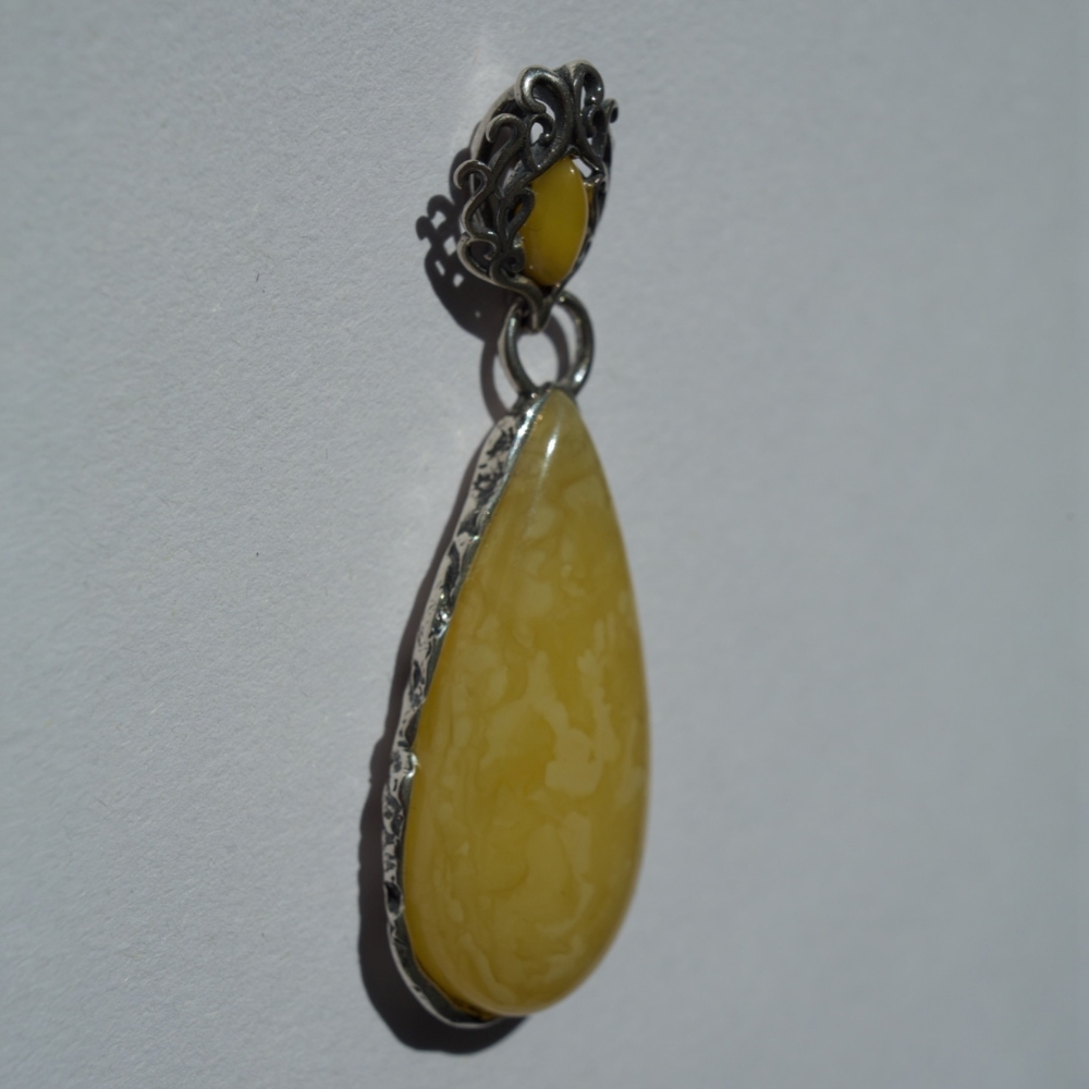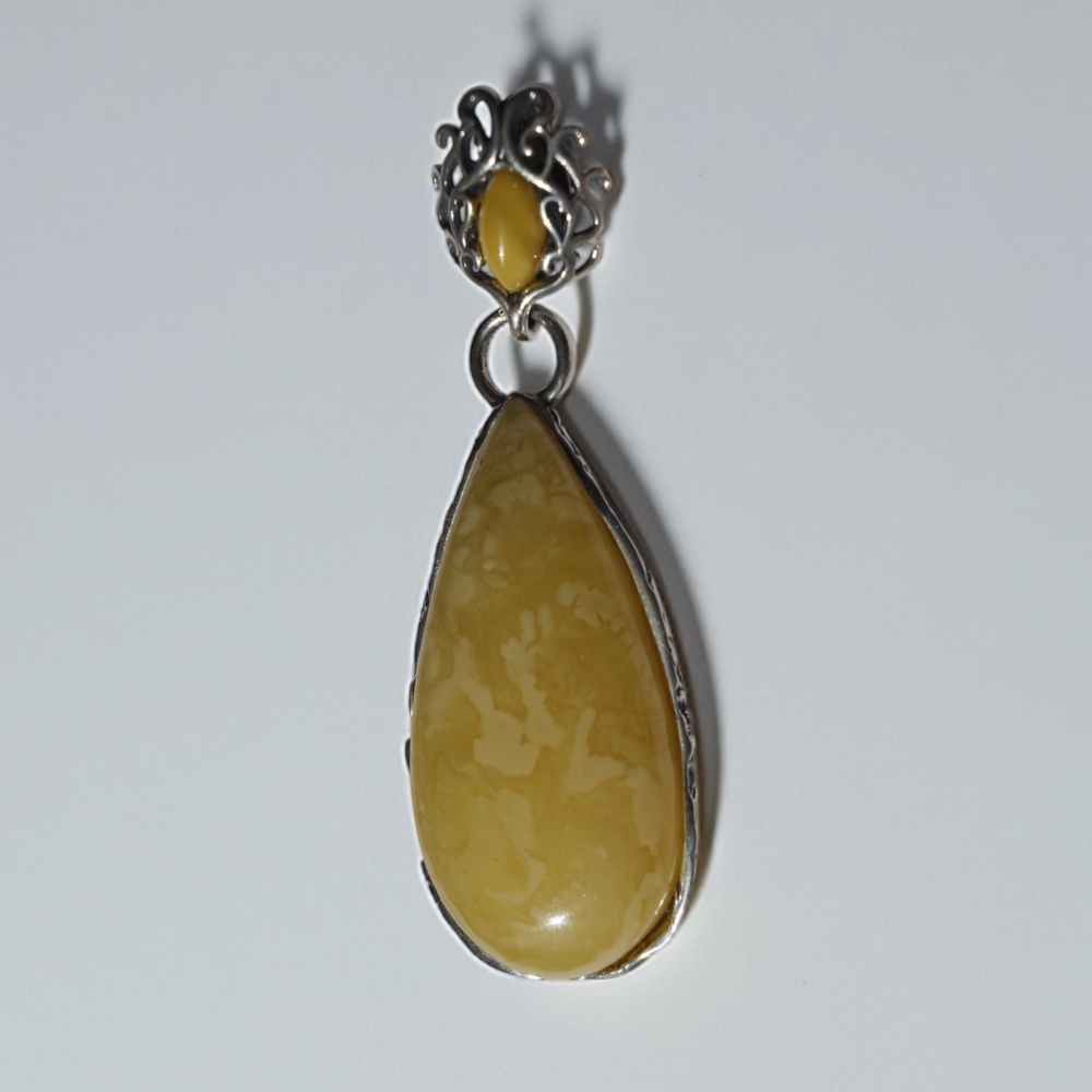 Ręcznie wykonany wisiorek o eleganckiej formie kropli, w którym główną rolę odgrywa duży bursztyn bałtycki w odcieniu miodowym. Naturalne wzory zamknięte w bursztynie nadają mu niepowtarzalny charakter. Całość dopełnia mniejszy bursztyn, osadzony w misternie zdobionej oprawie przy zawieszce, co dodaje biżuterii subtelnego, artystycznego wykończenia.