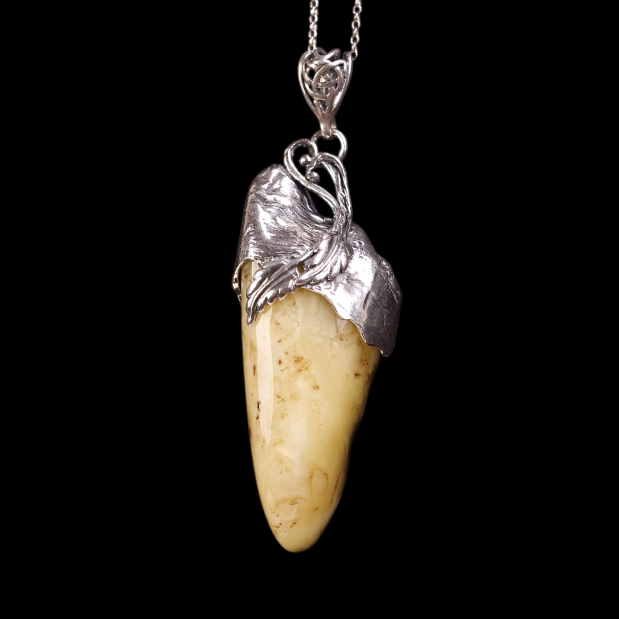 Srebro próby 925 · naturalny bursztyn bałtycki (mleczny) · waga 36 g · wymiary 9,5 x 4 cm · wysokość ok. 3 cm · wykonanie ręczne · bez łańcuszka