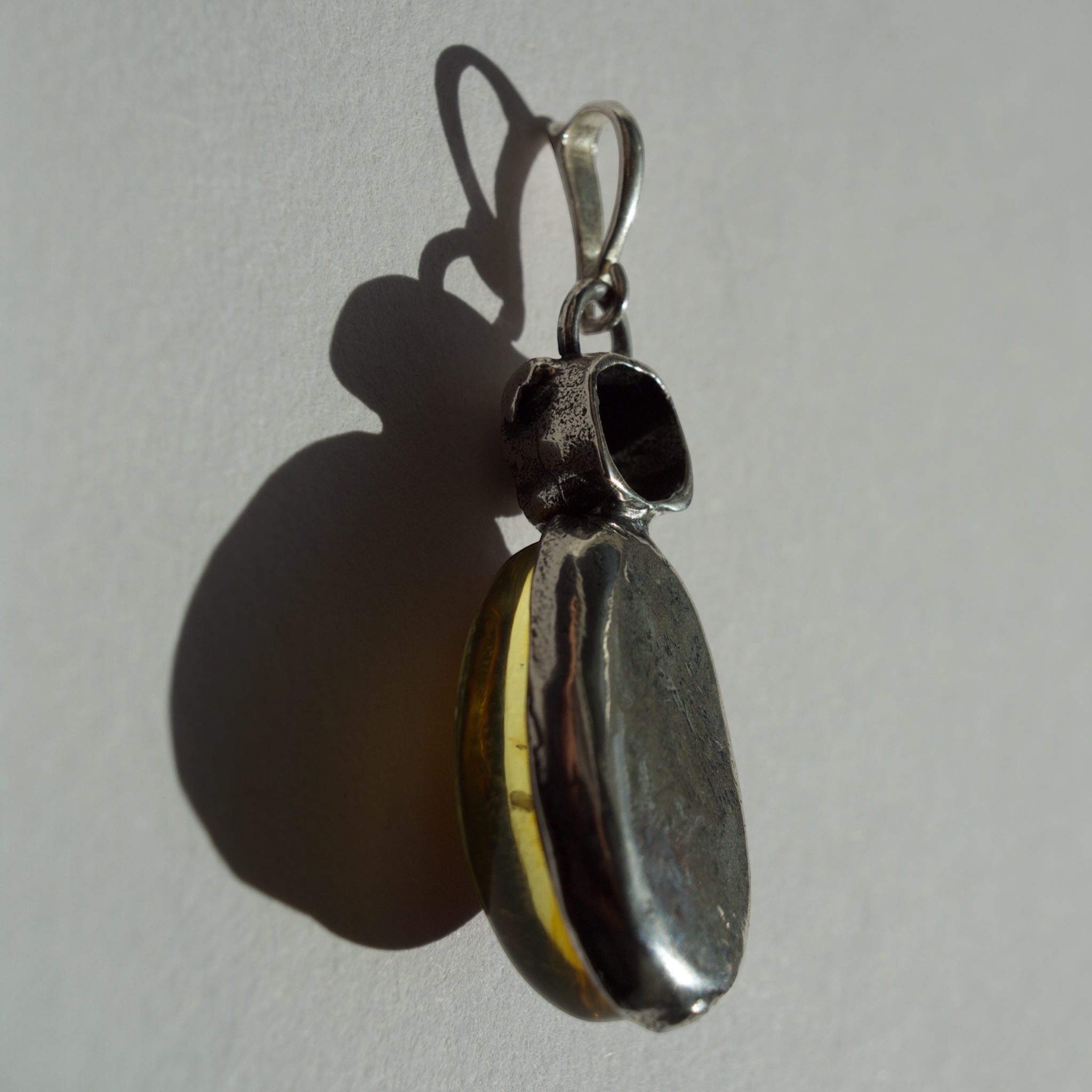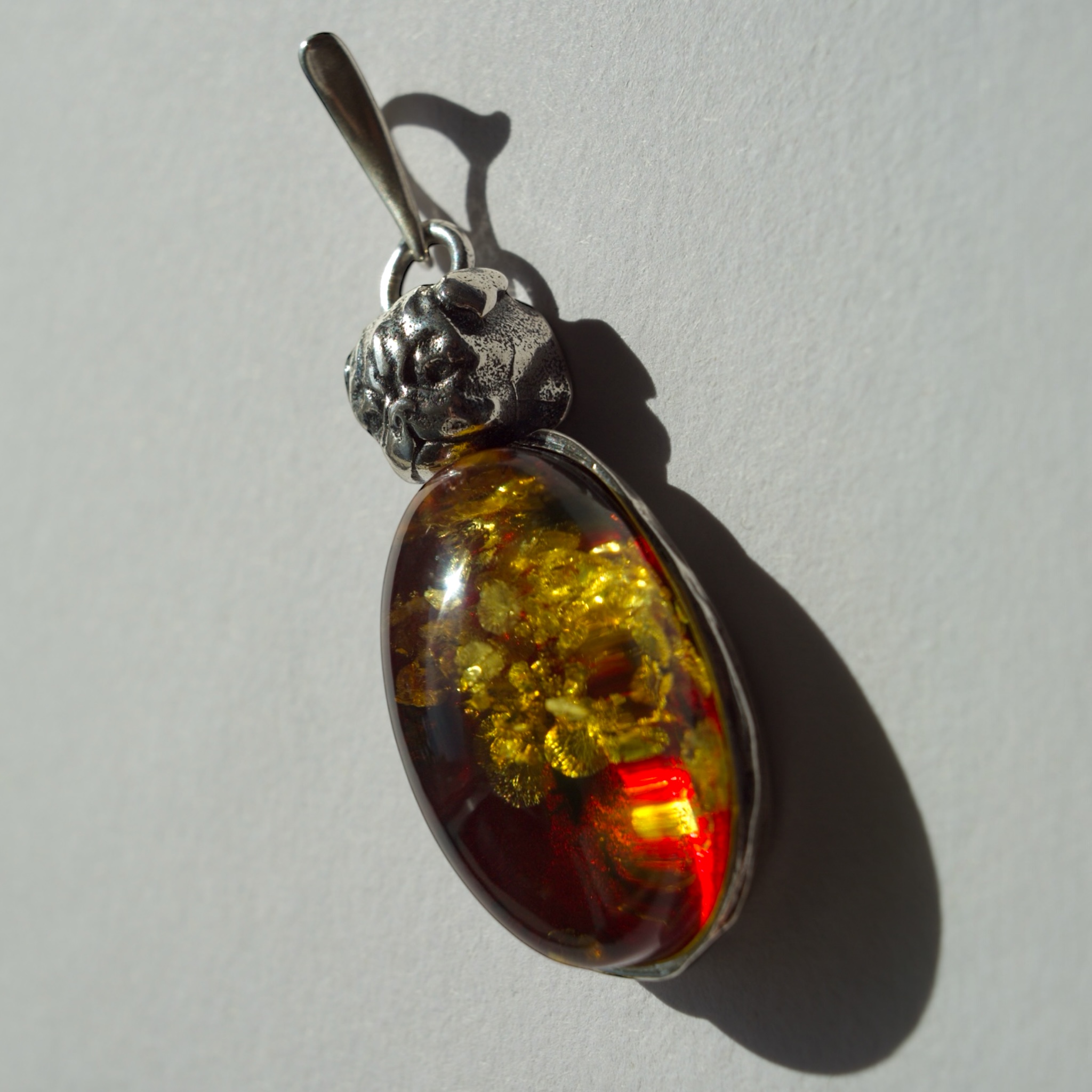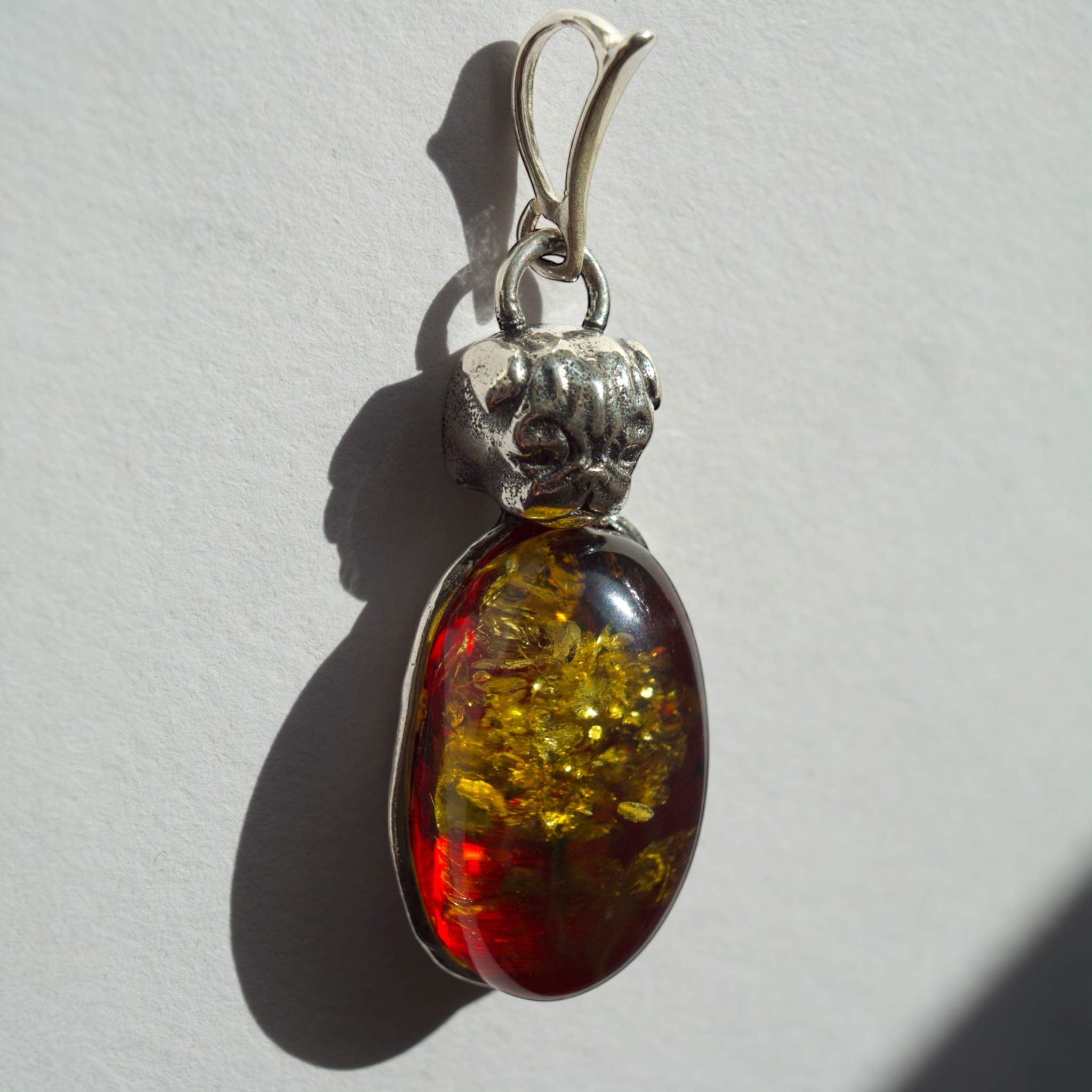 Ręcznie wykonany wisiorek z naturalnym bursztynem bałtyckim w intensywnym kolorze, który pięknie mieni się w świetle. Ozdobnym detalem jest srebrna główka psa umieszczona nad bursztynem - starannie wykonana i pełna charakteru. Całość tworzy biżuterię oryginalną, przyciągającą uwagę i dopracowaną w każdym szczególe.