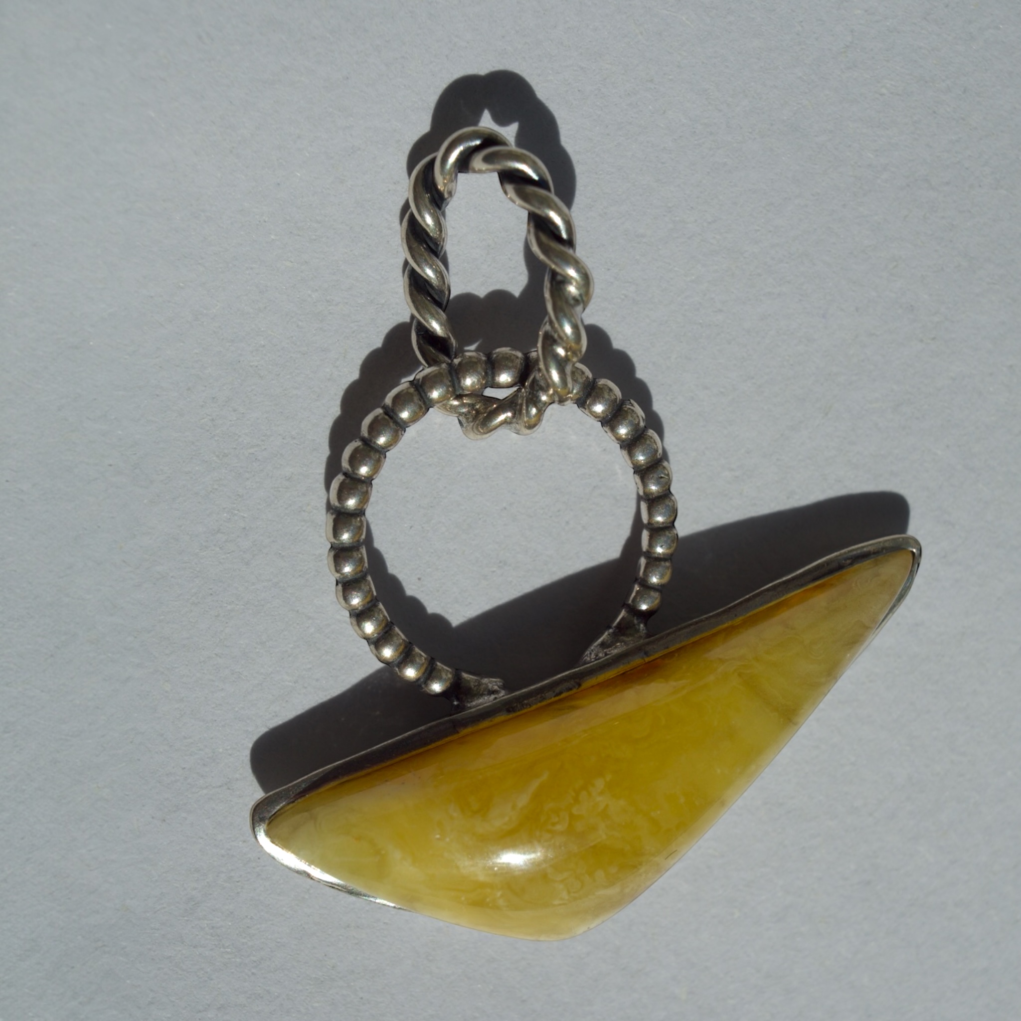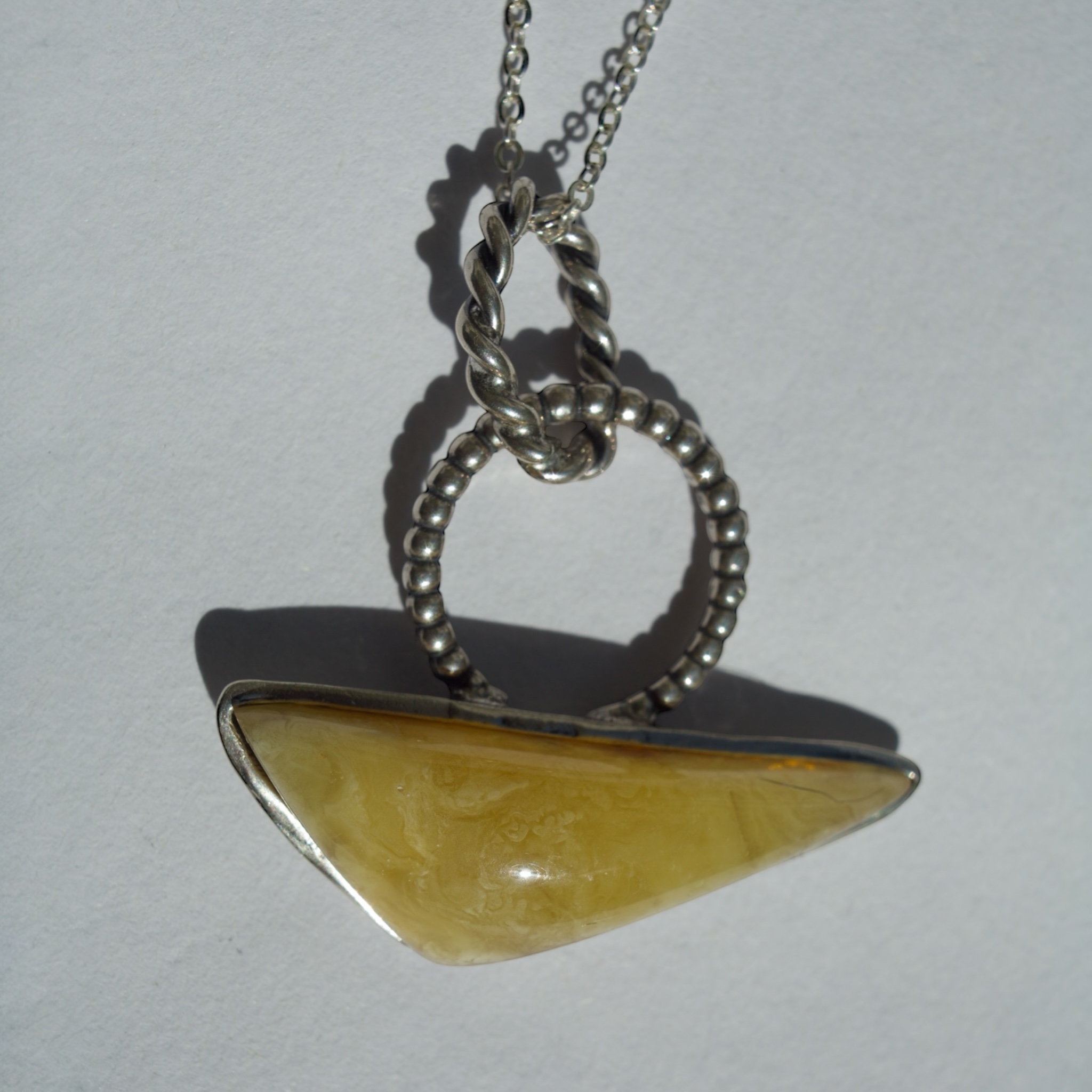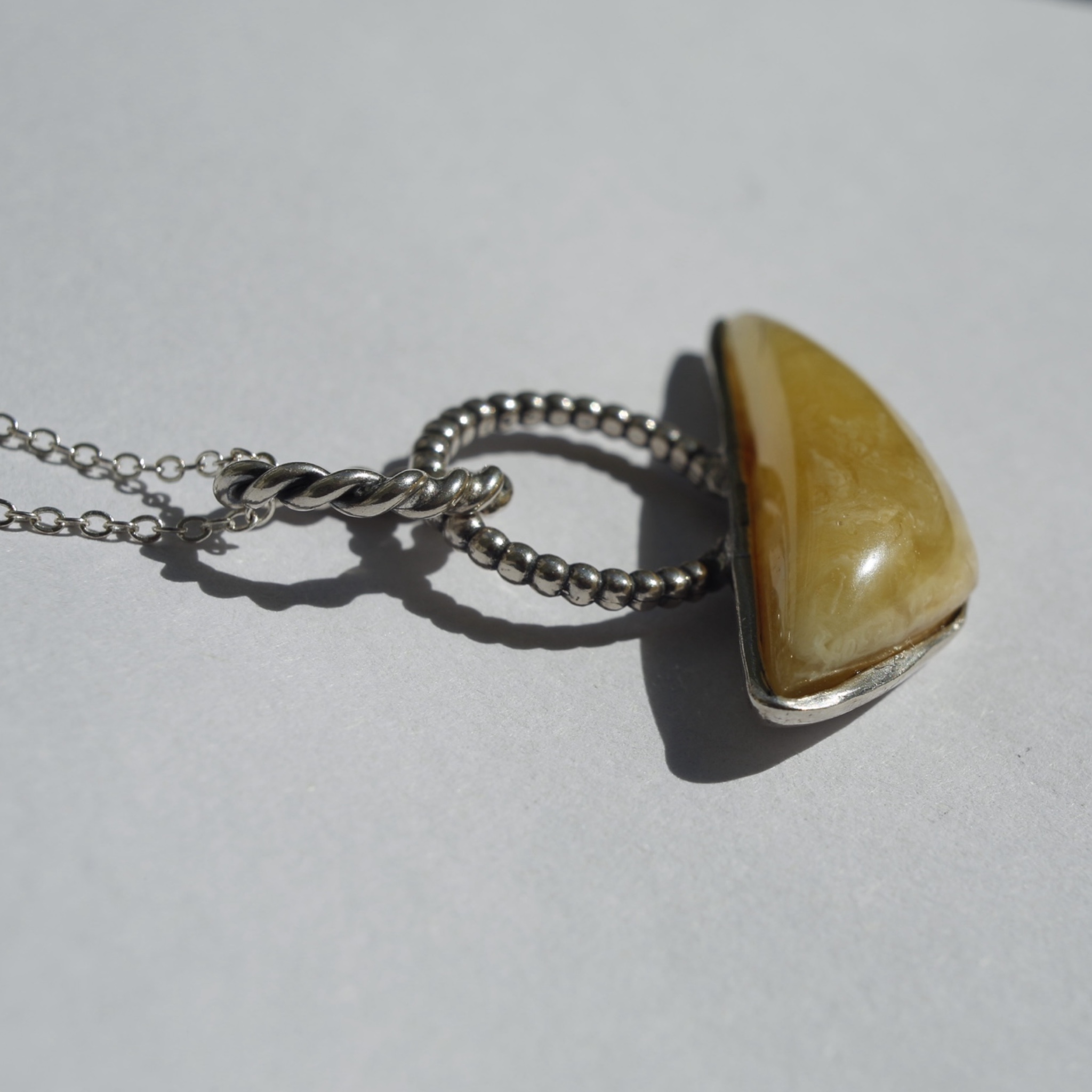 Ten nietuzinkowy, ręcznie wykonany wisiorek wyróżnia się nowoczesną formą i wyrazistym charakterem. Centralnym elementem jest naturalny bursztyn bałtycki w żółto-mlecznym odcieniu, osadzony w srebrnej oprawie. Jego geometryczny kształt podkreślają ozdobne srebrne pierścienie - gładko skręcony i fakturowany z kuleczek – które nadają kompozycji lekkości i artystycznego wyrazu. To biżuteria, która łączy tradycję z nowoczesnym designem.