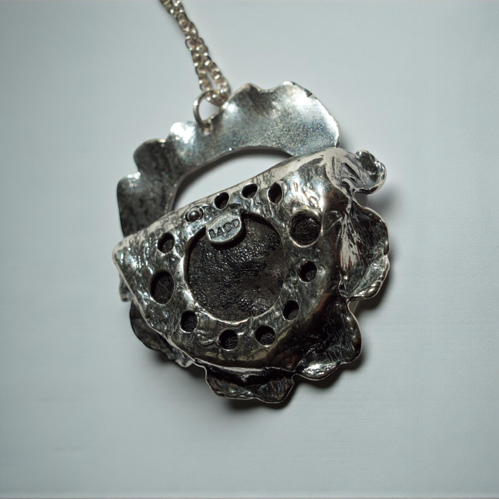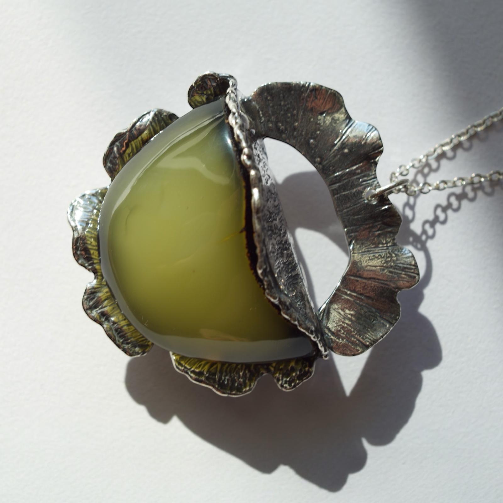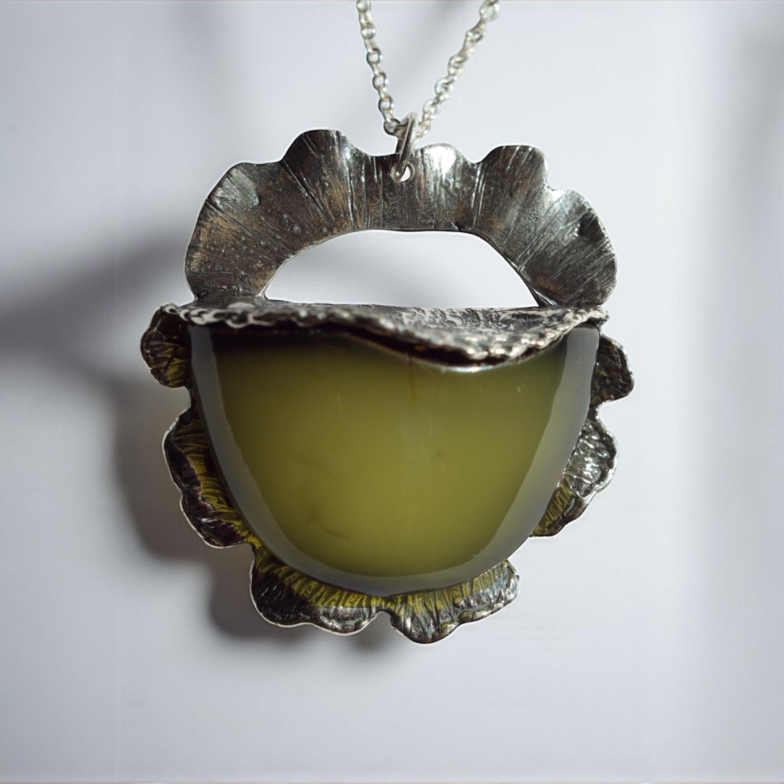Ręcznie wykonany, masywny wisiorek z naturalnym bursztynem bałtyckim w głębokiej, zielonkawej tonacji. Bursztyn osadzony został w dekoracyjnej srebrnej oprawie o organicznej formie przypominającej płatki. Wisiorek posiada kółko do powieszenia o średnicy ok. 0,6 cm.