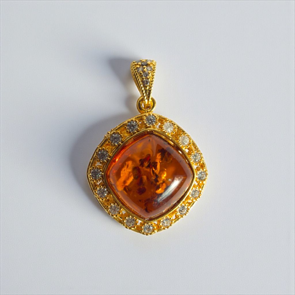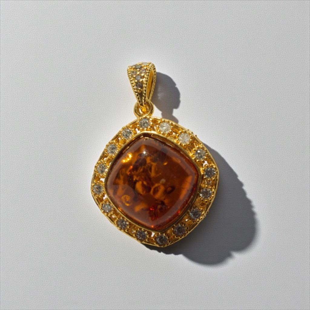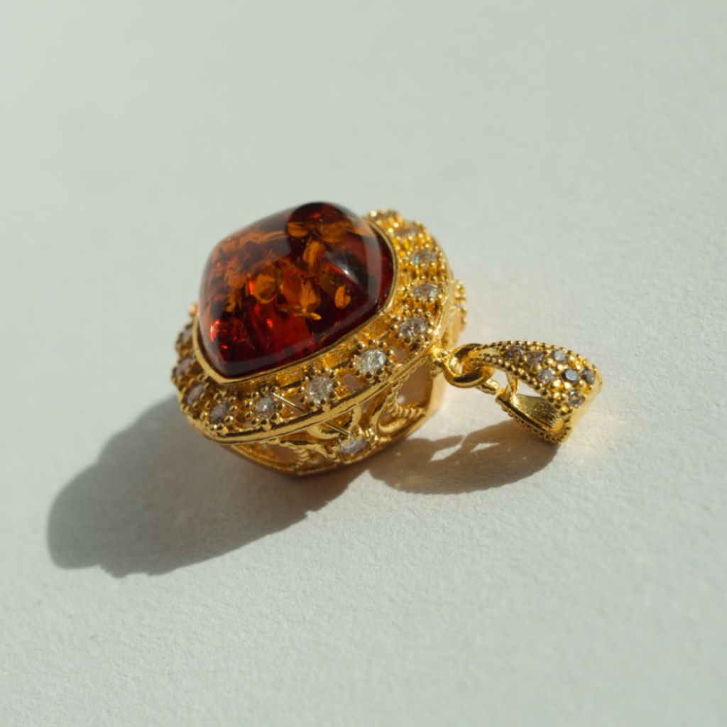 Elegancki wisiorek, w którym głębia koniakowego bursztynu spotyka się z blaskiem cyrkonii. Złocona oprawa o przestrzennym koszyku nadaje formie lekkości i eksponuje naturalne piękno bursztynu, a subtelne zdobienia dodają mu wyrafinowanego charakteru. To wyjątkowa ozdoba, która przyciąga światło i wzrok, podkreślając klasę każdej stylizacji.