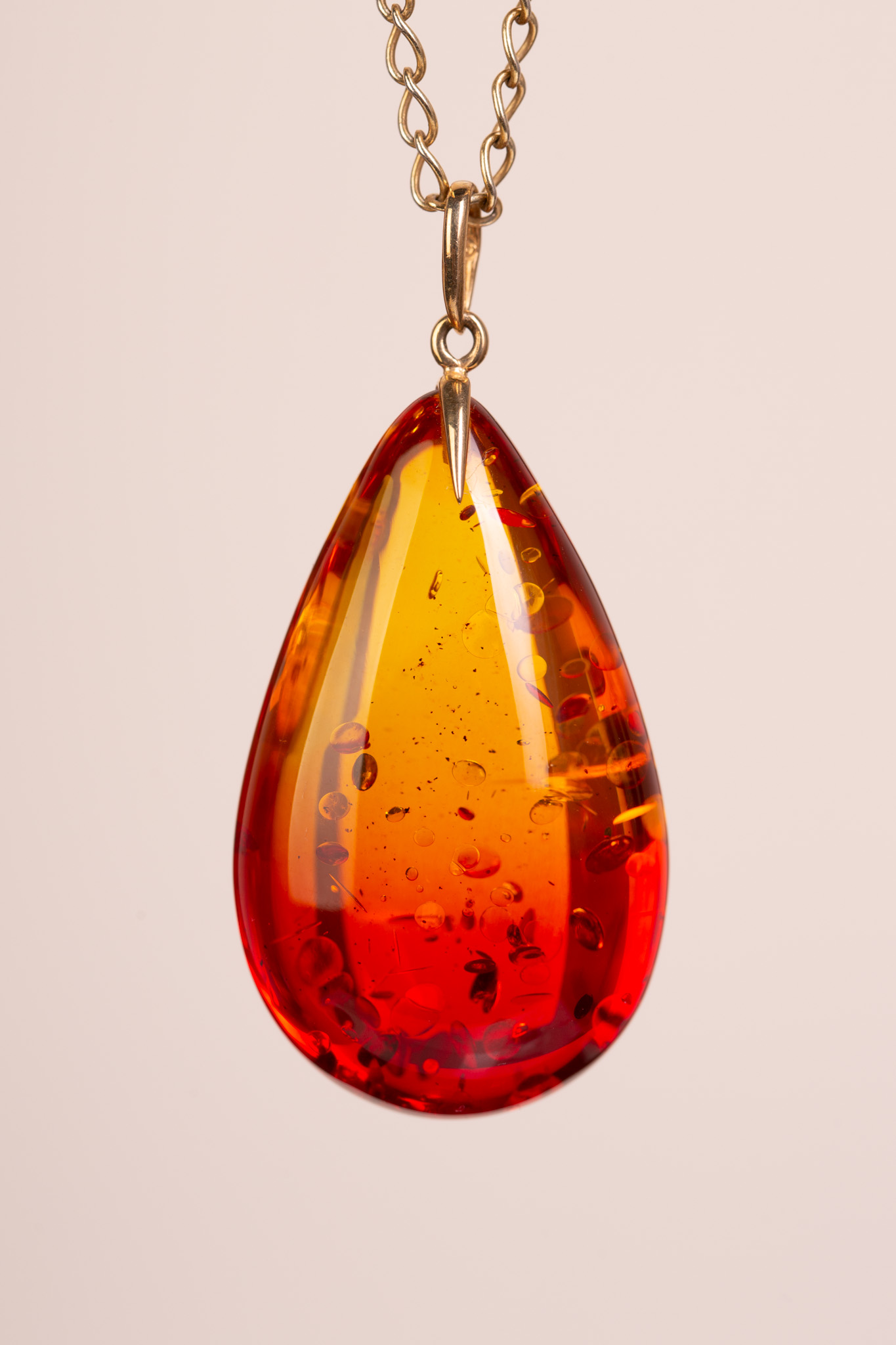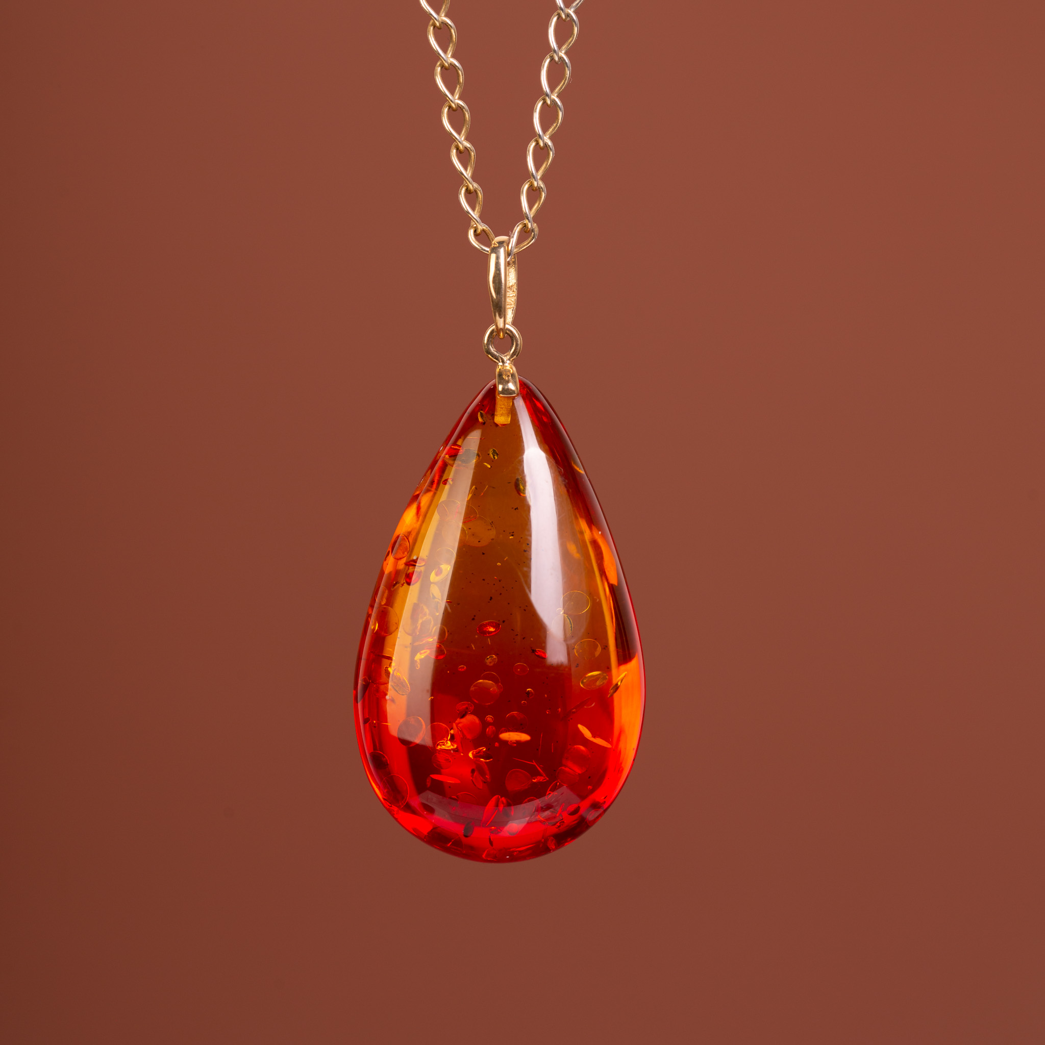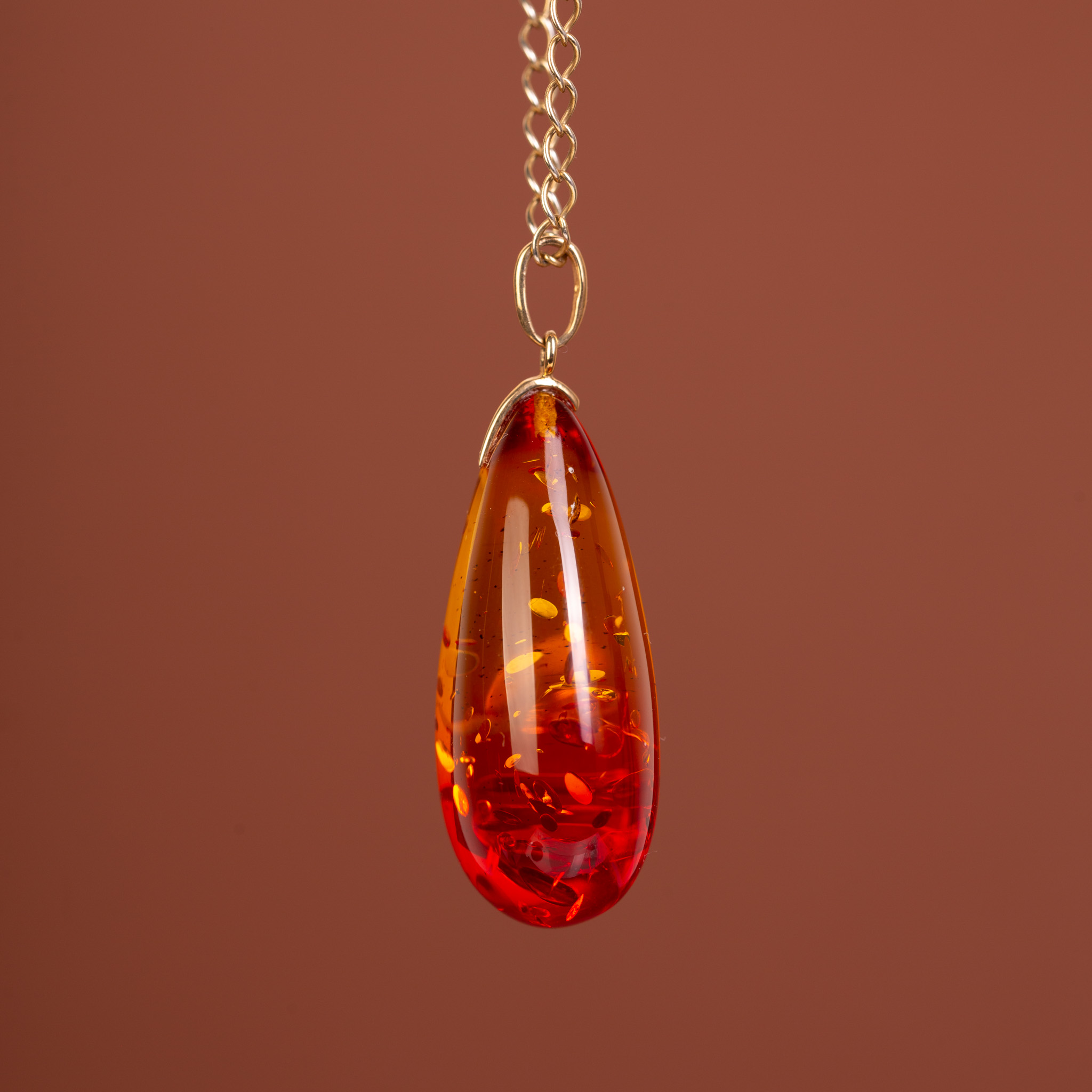 Elegancki wisiorek o klasycznym kształcie kropli, wykonany z bursztynu bałtyckiego poddanego procesowi barwienia. Dzięki temu bursztyn zyskał głęboki, nasycony odcień dojrzałej wiśni, który w górnej części płynnie przechodzi w słoneczny miodowy blask. Wnętrze bursztynu wypełniają naturalne łuski, które pod wpływem światła mienią się i dodają bryle niesamowitej głębi. Całość wieńczy minimalistyczna zawieszka wykonana z 14-karatowego złota (próba 585).