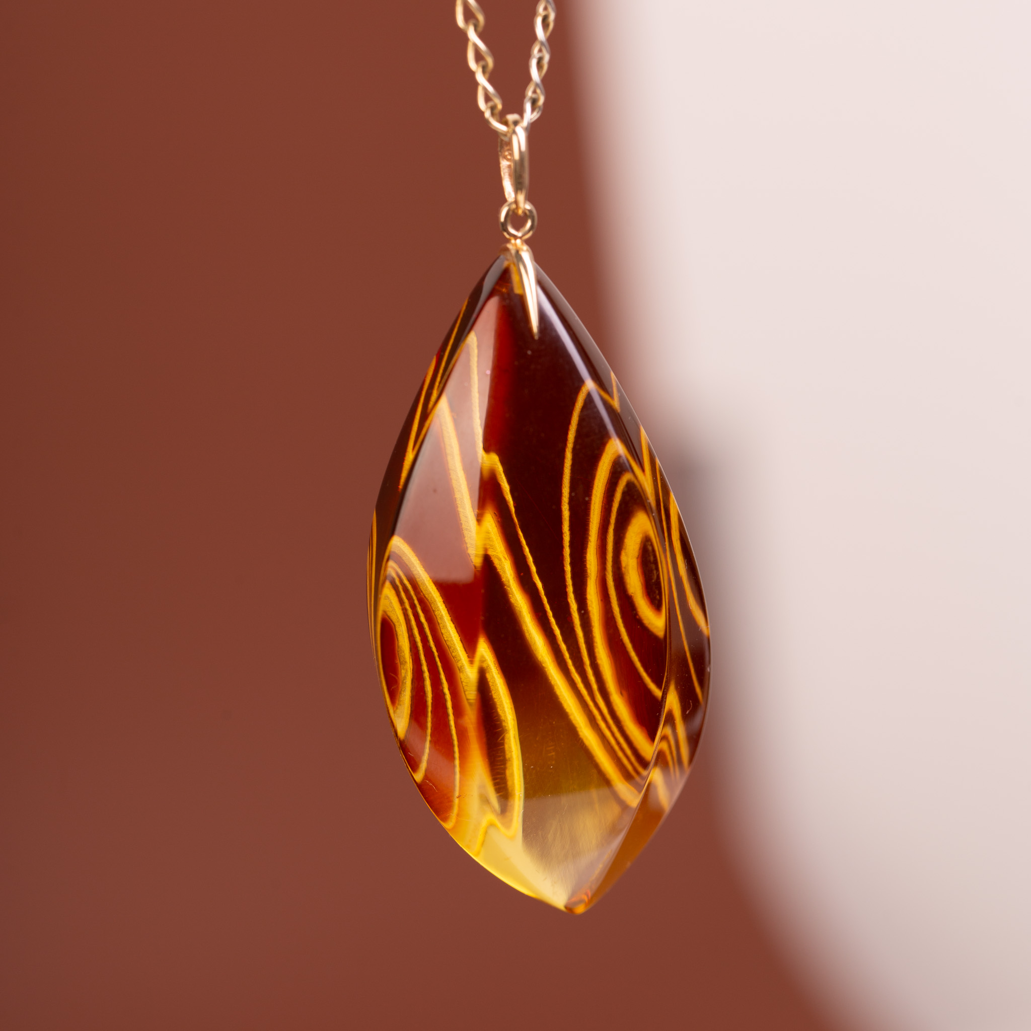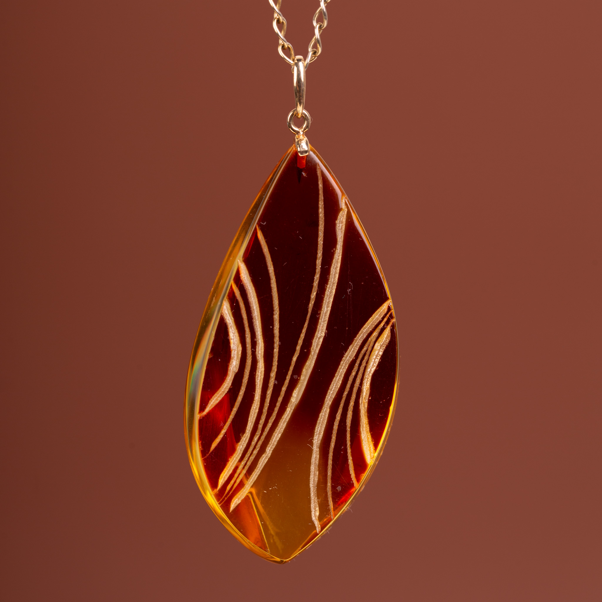 Luksusowy wisiorek wykonany z 14-karatowego złota (próba 585), w którym osadzono misternie rzeźbiony bursztyn bałtycki. Bursztyn został poddany procesowi barwienia, co pozwoliło uzyskać głęboki, ciemnobrązowy odcień, stanowiący idealne tło dla wyrzeźbionych, złocistych linii. Dynamiczny wzór przypomina strukturę pióra, a gra świateł na nacięciach wydobywa z wnętrza bursztynu niesamowitą głębię.