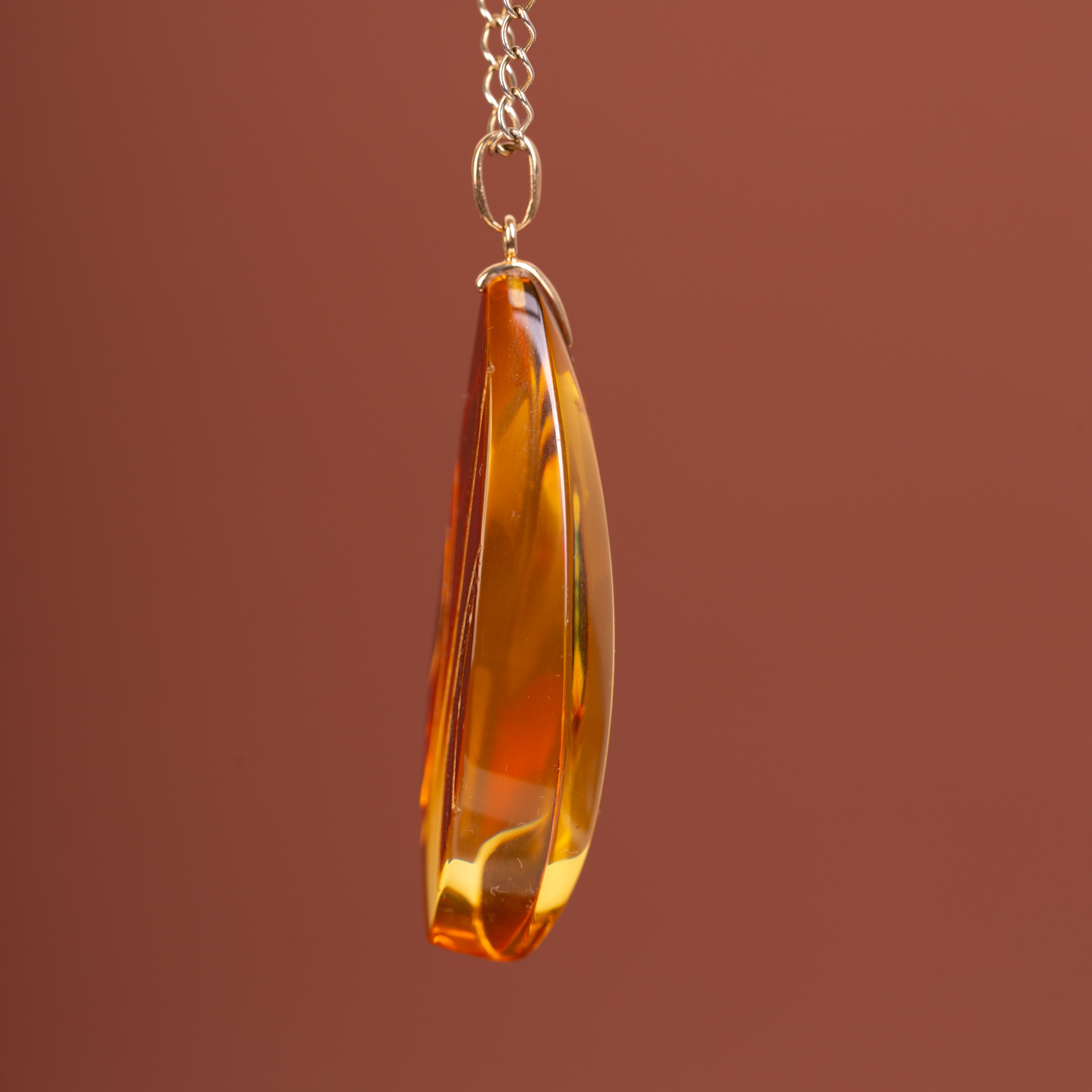 Waga i odczucie: 9,2 g – ciężar odpowiadający dwóm pełnym kostkom czekolady. Wisiorek jest solidny i wyraźnie wyczuwalny, co podkreśla wysoką jakość użytego kruszcu, a jednocześnie pozostaje bardzo komfortowy w noszeniu. Szlachetność złota i gładkość bursztynu dają wyjątkowe poczucie obcowania z produktem luksusowym.