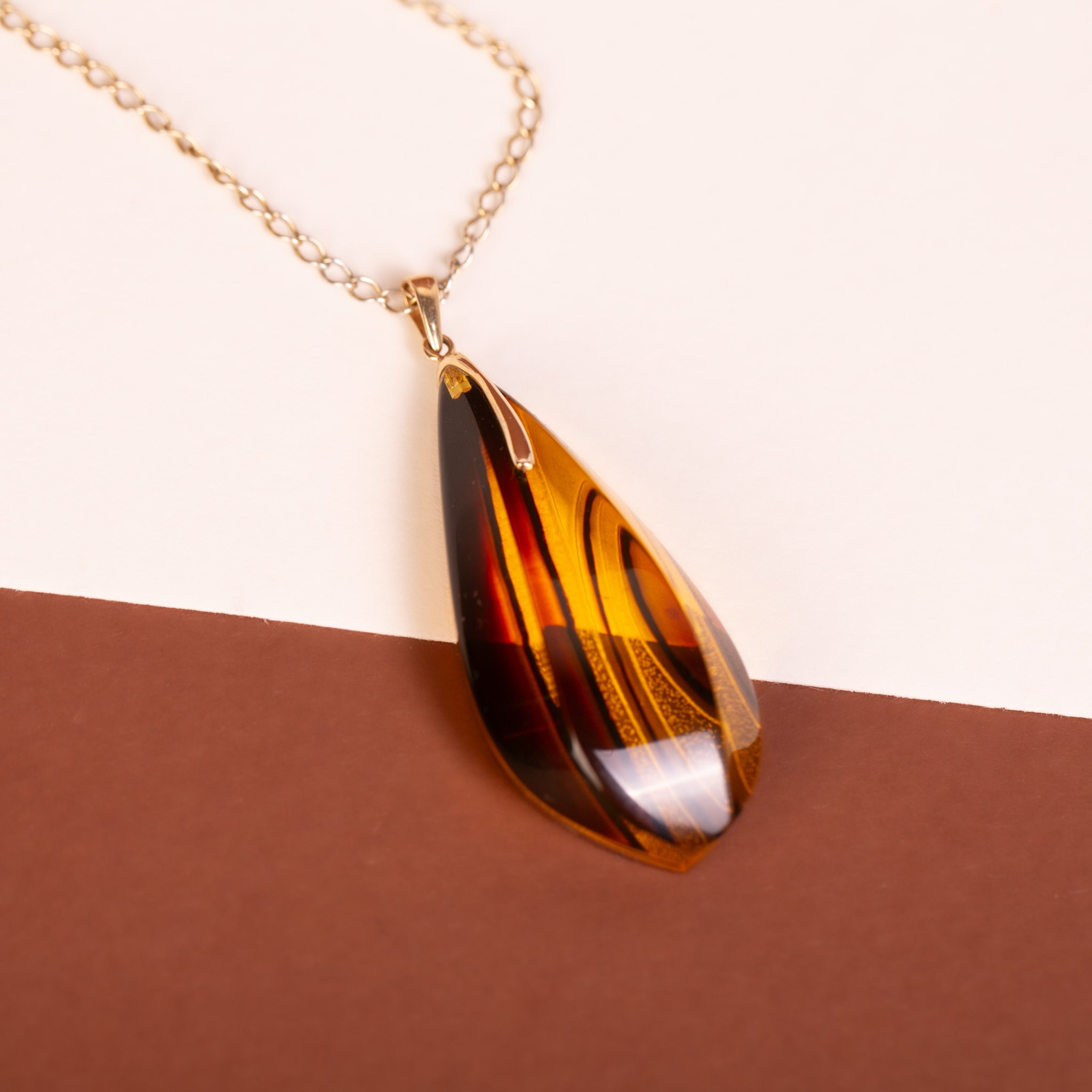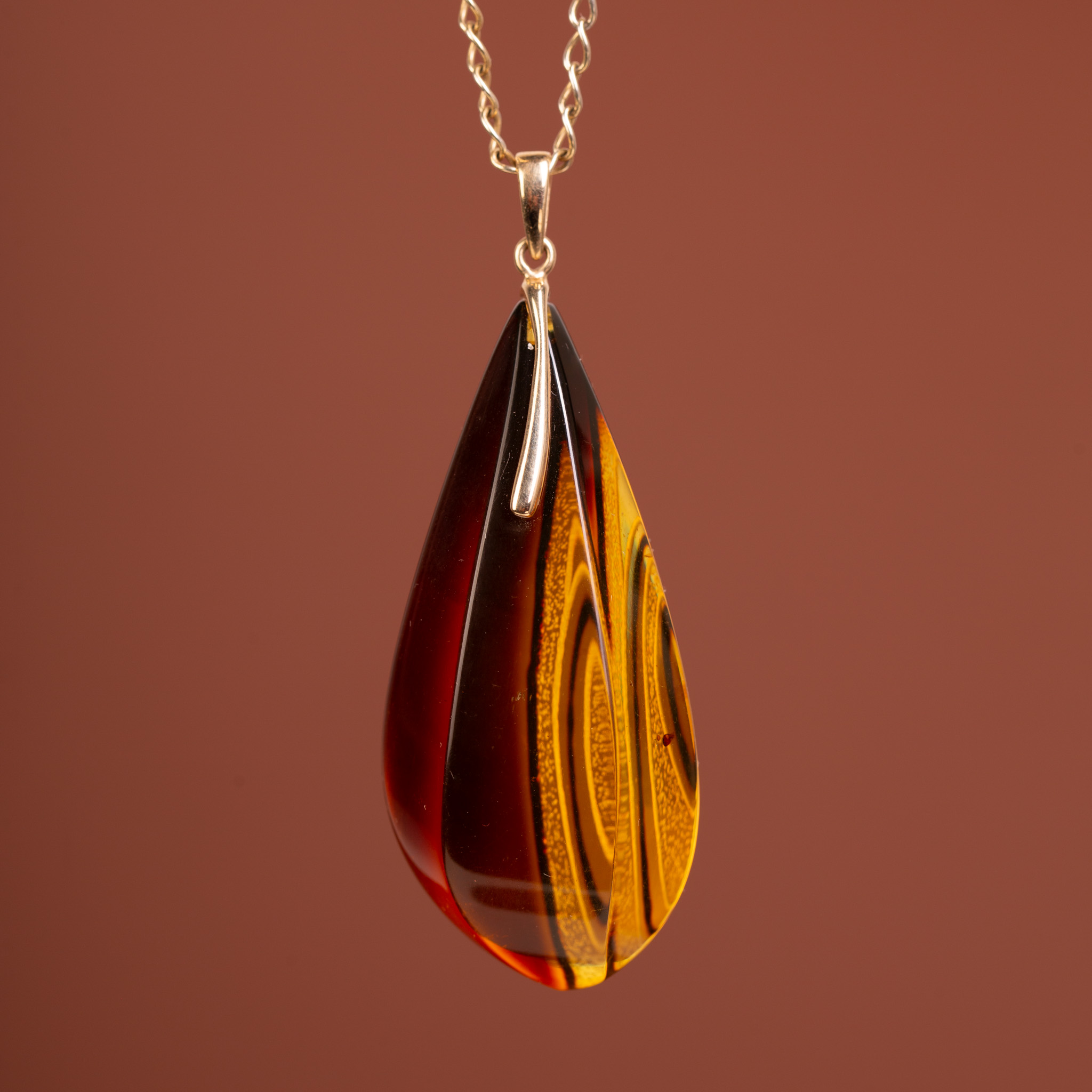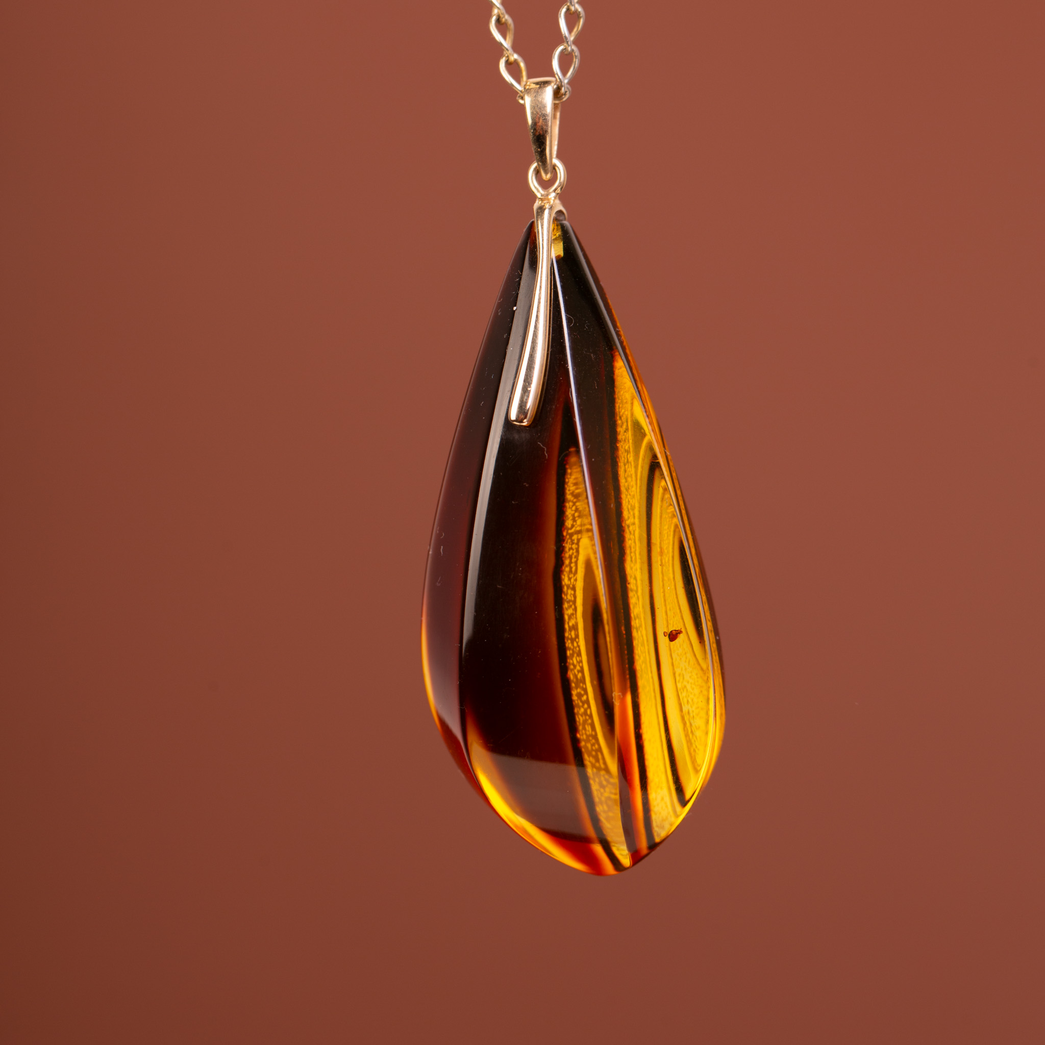 Luksusowy wisiorek wykonany z 14-karatowego złota (próba 585), w którym osadzono unikatowy, rzeźbiony bursztyn bałtycki. Bursztyn został poddany procesowi klarowania, co pozwoliło uzyskać niesamowitą głębię i przejrzystość, a następnie został misternie wyrzeźbiony. Powierzchnię bursztynu zdobią dynamiczne, faliste linie, które w połączeniu z intensywną, miodowo-koniakową barwą tworzą efekt przypominający zastygły płomień.